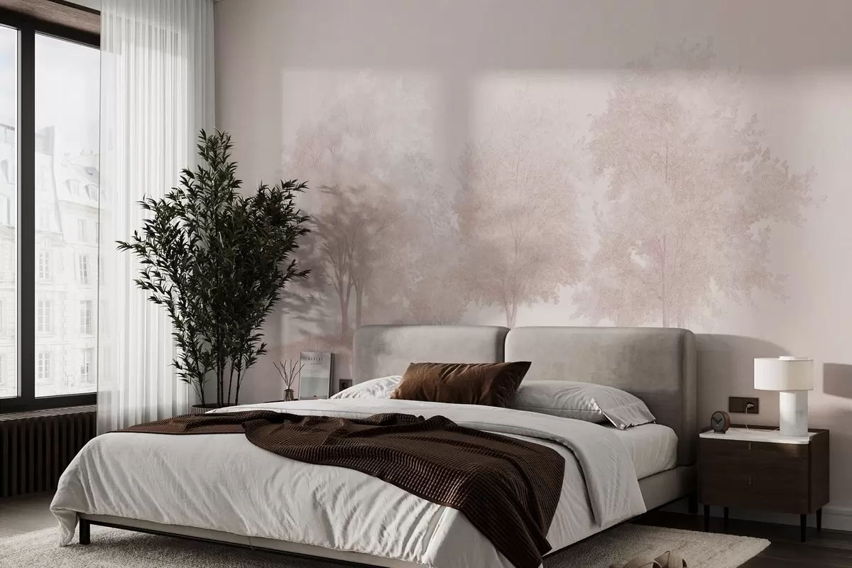 Fotomurales Árboles en flor, primavera, dibujo a lápiz, colores rosas, naturaleza Nr. w03549