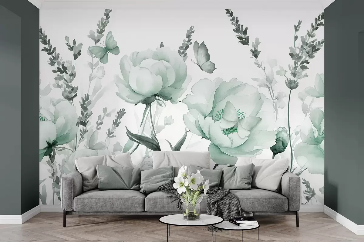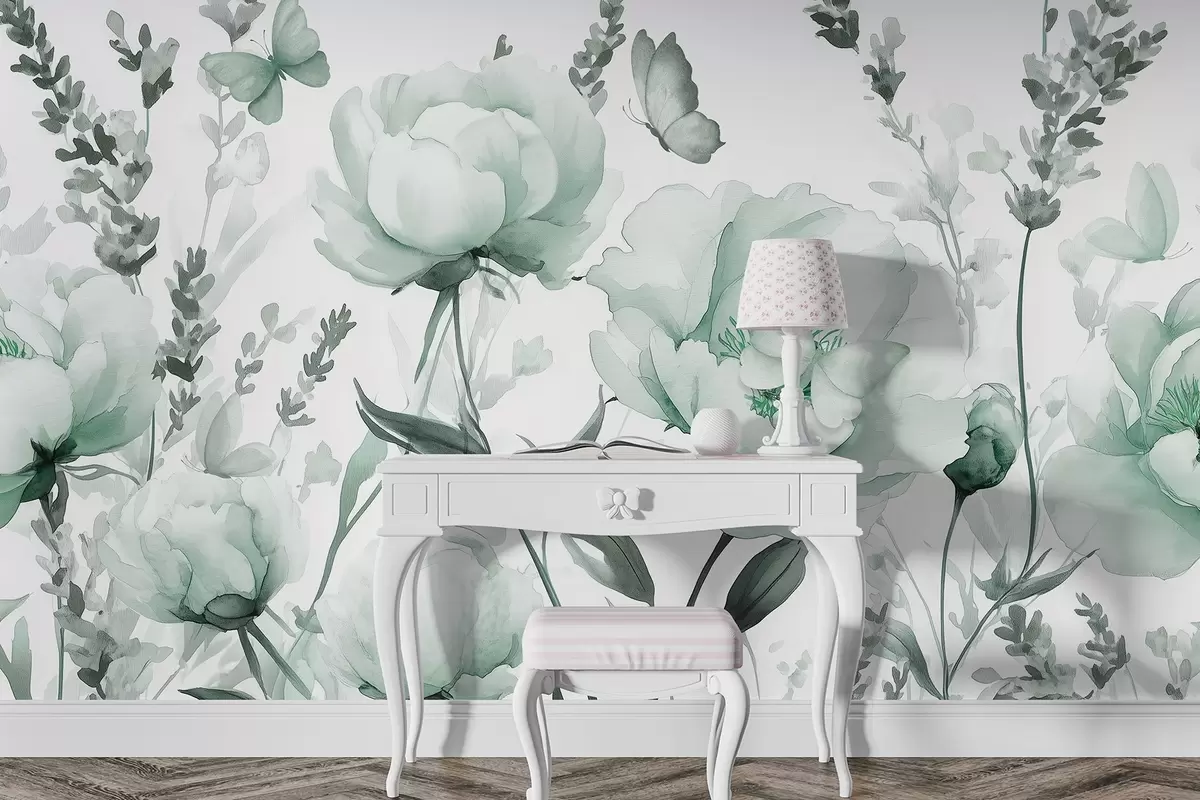 Fotomurales Pradera de flores, peonías, lavanda, mariposas, estilo acuarela, colores verdes Nr. w03668v1