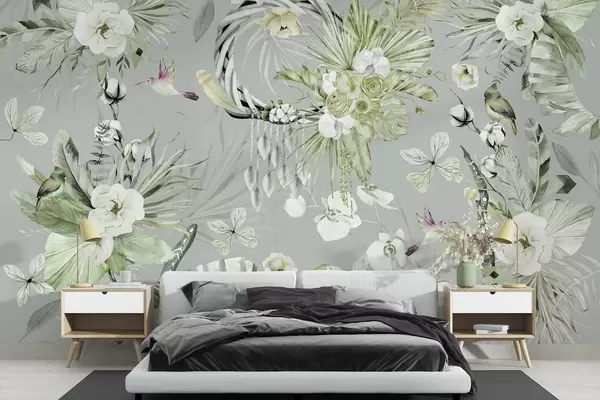 Fotomurales Adorno de estilo boho con flores de peonía y pájaros, estilo acuarela, colores verdes Nr. w03885v2