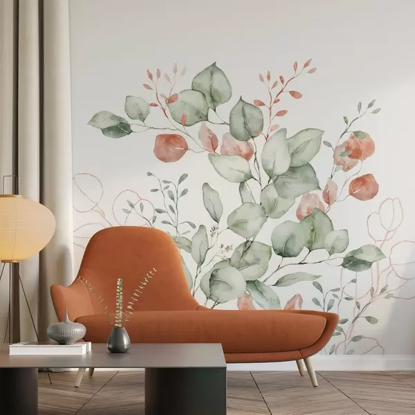 Fotomurales Vegetación y ramas imitación de acuarela texturizada, tonos verdes y rojos Nr. w03927v1