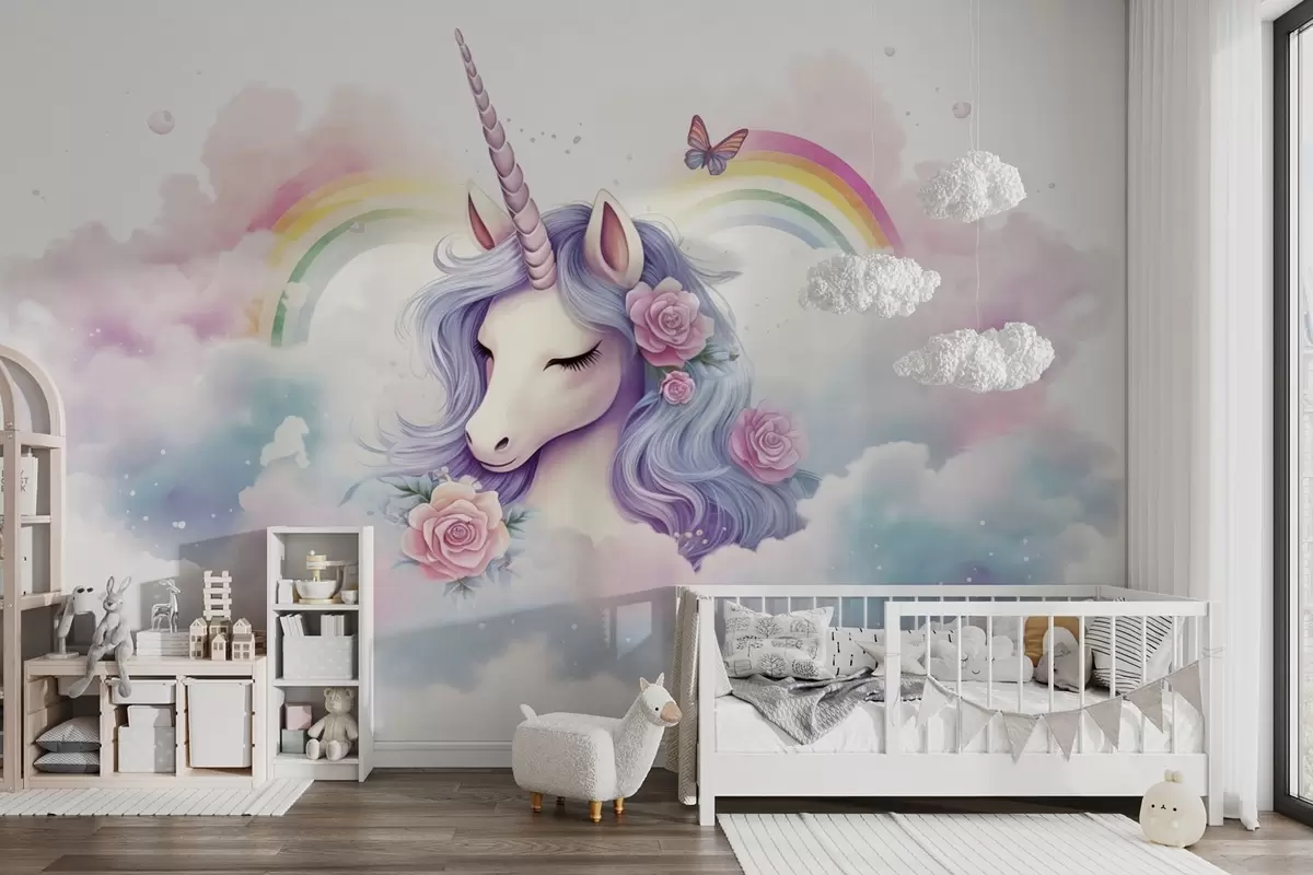 Fotomurales Unicornio pastel entre las nubes con arcoíris y rosas Nr. w03990