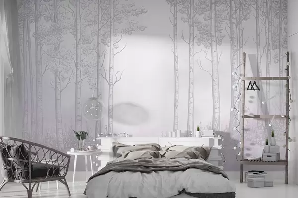 Fotomurales Bosque con abedules, minimalismo, naturaleza, paleta de colores rosa Nr. w04009v2