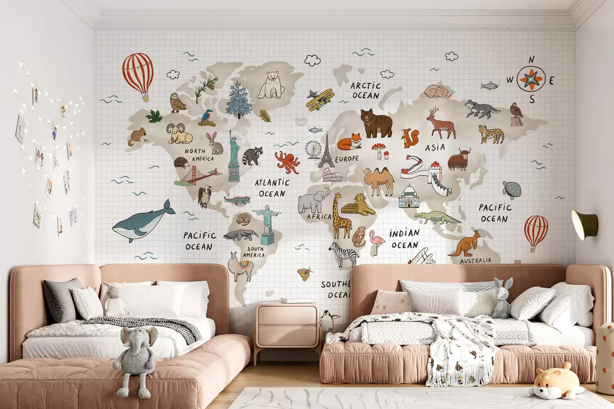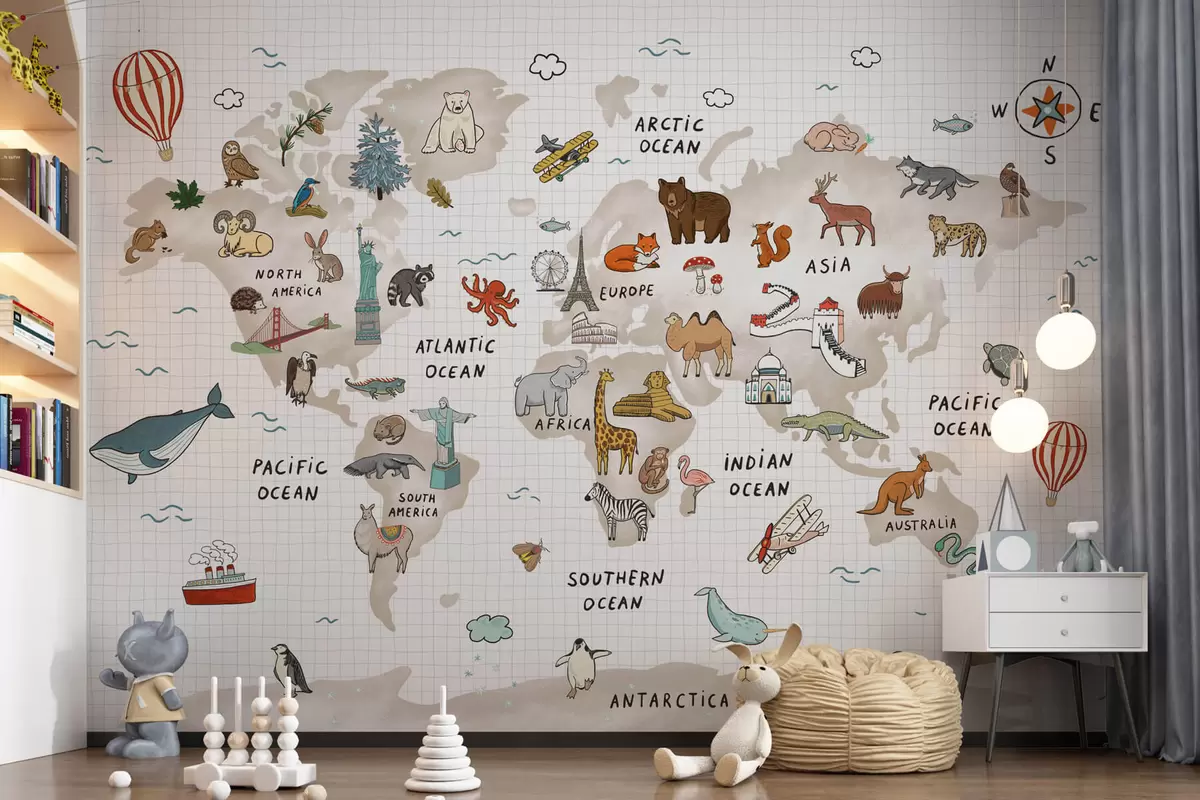 Fotomurales Mapamundi con animales y puntos de referencia Nr. w04011
