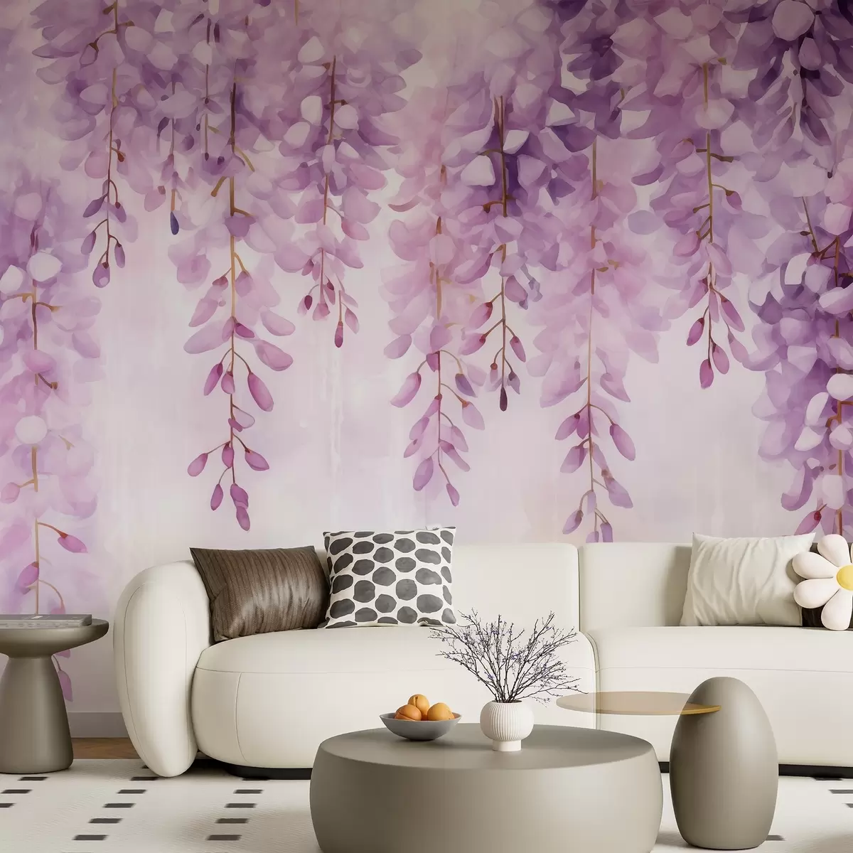 Fotomurales Delicada composición en acuarela con glicinas en cascada en suaves tonos lavanda y rosa, creando un ambiente de paz, Nr. w04034