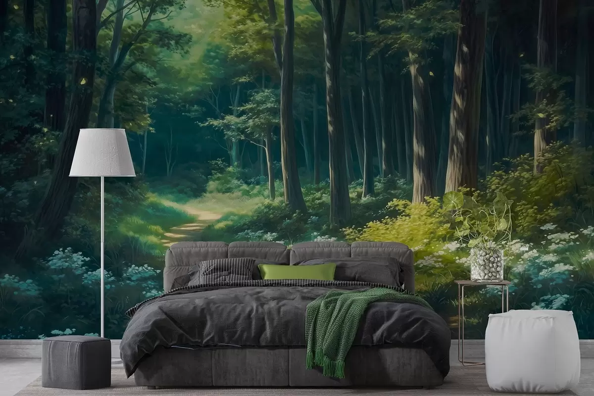 Fotomurales Bosque verde con suave luz solar, árboles y flores blancas, dibujo al óleo Nr. w04118
