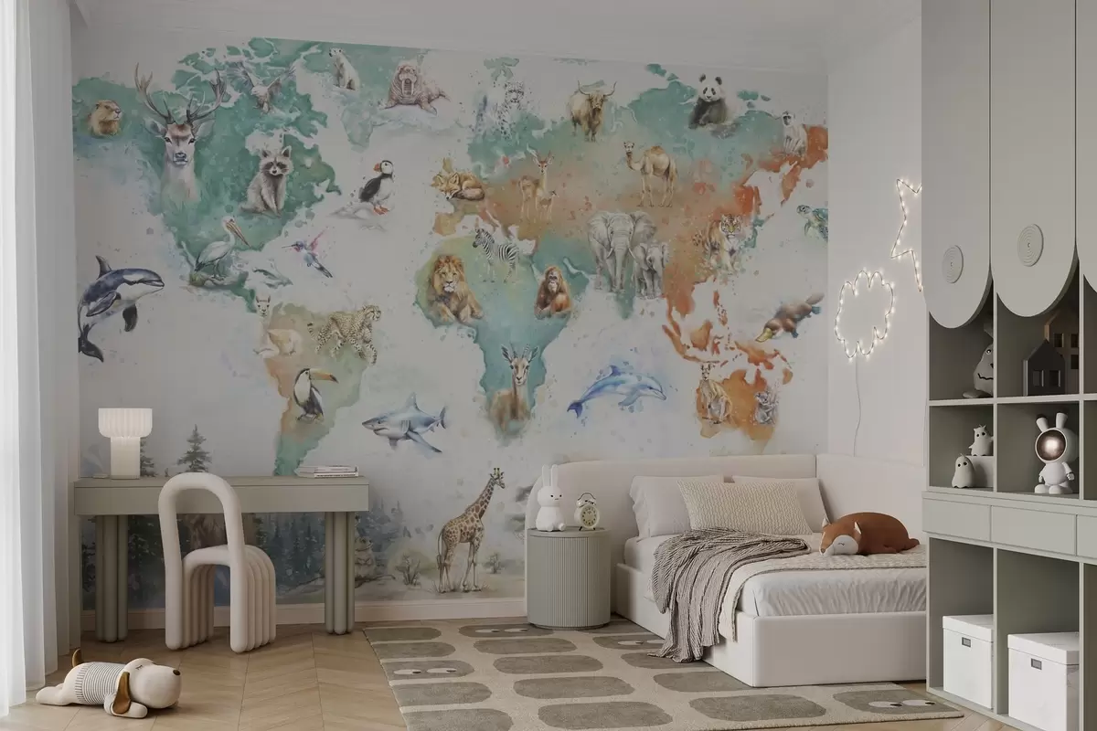 Fotomurales Mapamundi con animales, estilo de ilustración educativa infantil Nr. w04148