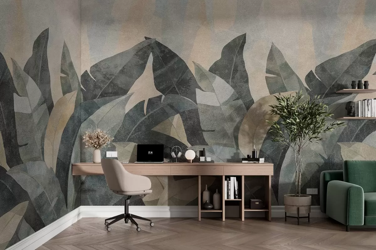 Fotomurales hojas de plátano texturizadas en tonos naturales de beige, verde y gris Nr. w04285