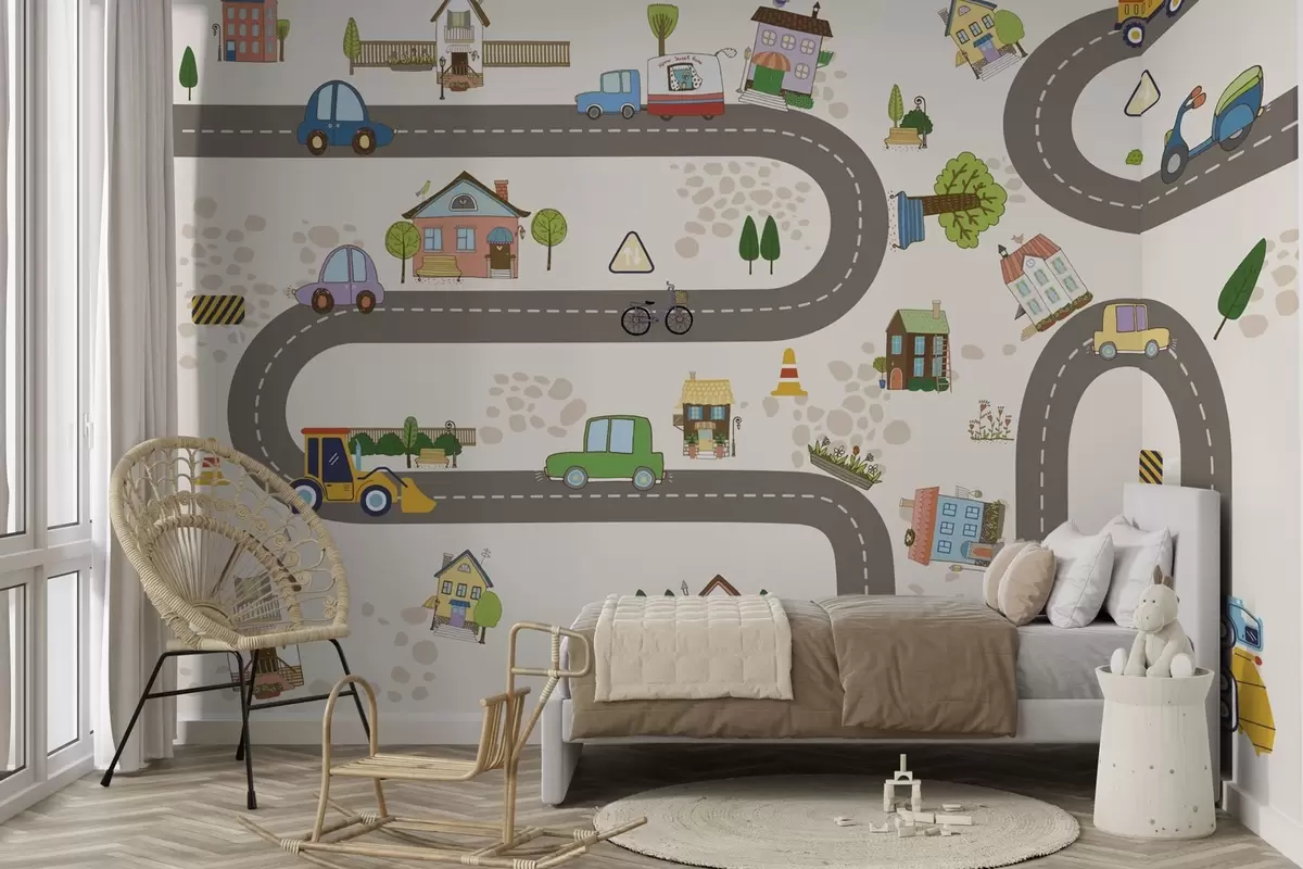 Fotomurales Carretera infantil con coches y casas de colores Nr. w04404