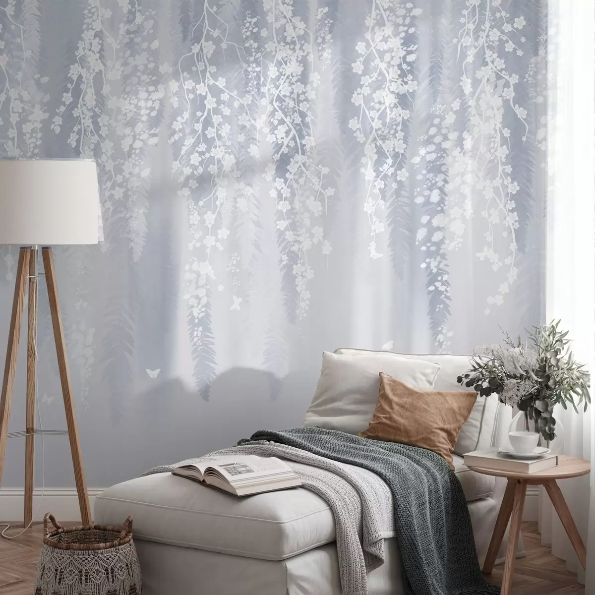 Fotomurales Fresca versión azul de ramas con flores blancas Nr. w04417v2