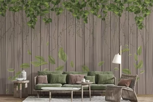 Fotomurales Tablas de madera imitación con hojas colgantes Nr. w04603