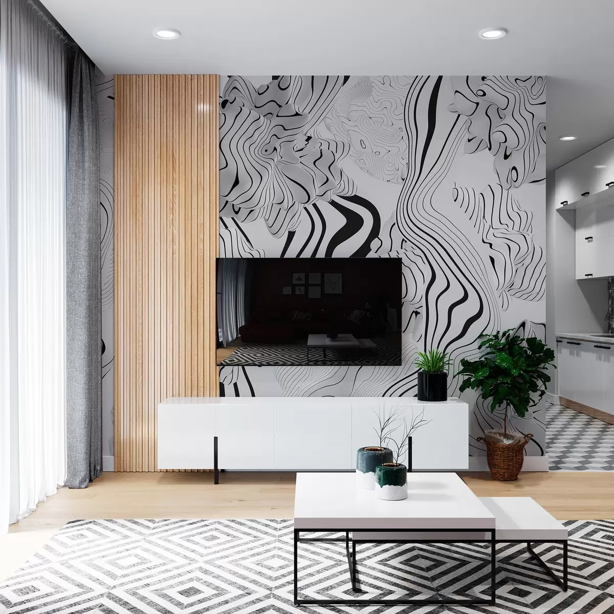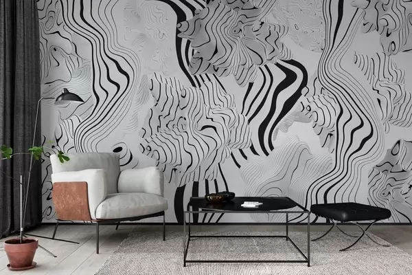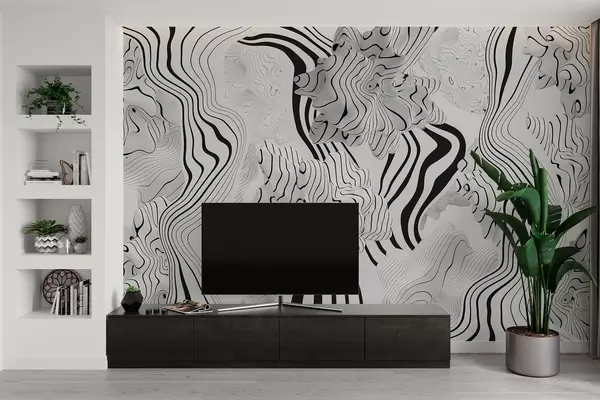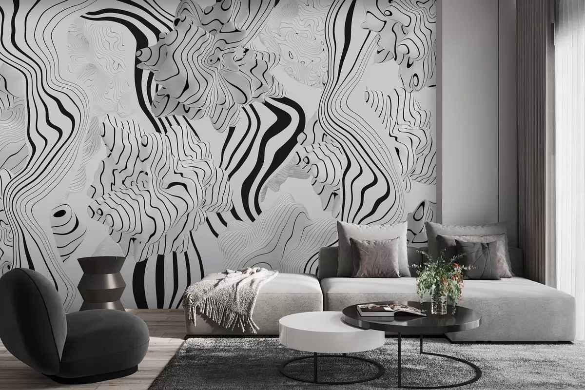 murales de pared formas orgánicas abstractas en estilo 3D en tonos blancos y grises con rayas negras w04627