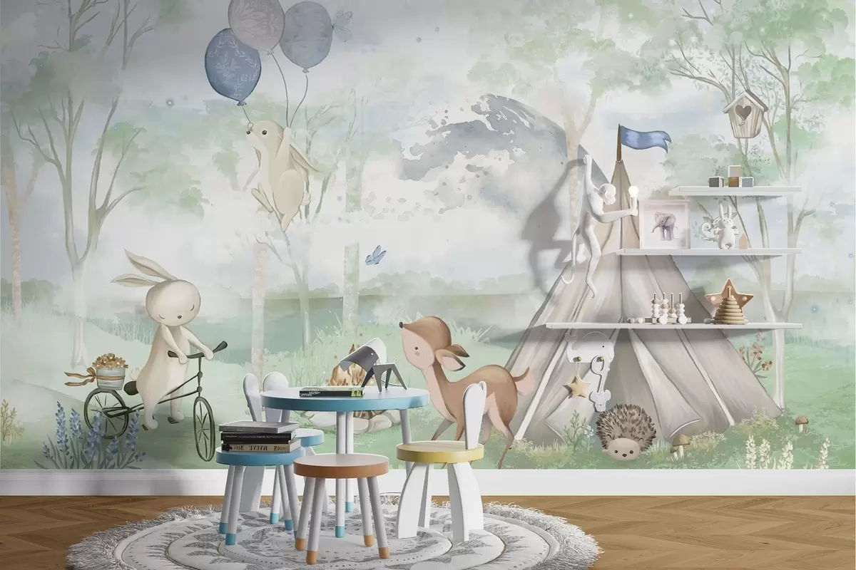 Fotomurales Campamento infantil en el bosque: conejitos, cervatillos, tienda de campaña y hoguera Nr. w04671v1