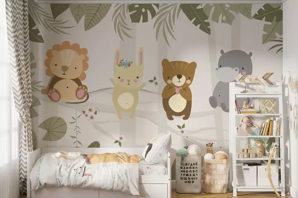 Fotomurales Lindo león, conejo, oso e hipopótamo entre las hojas Nr. w04682