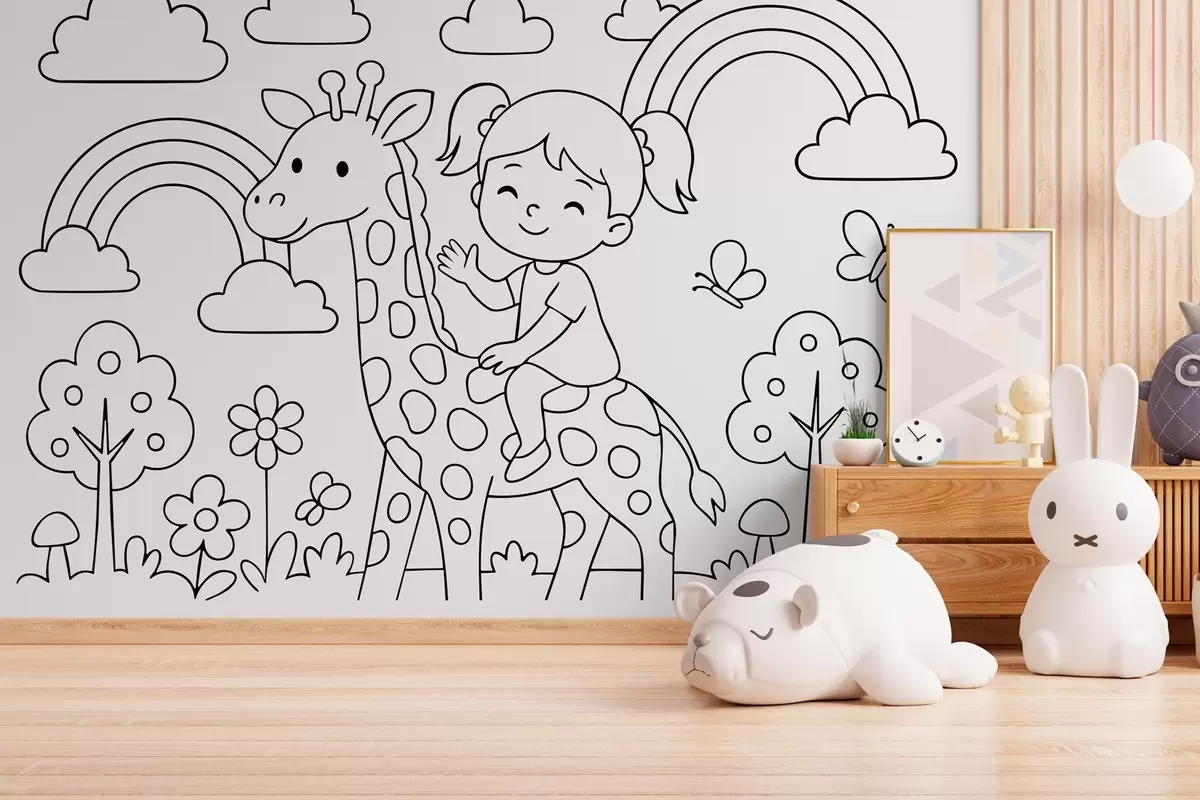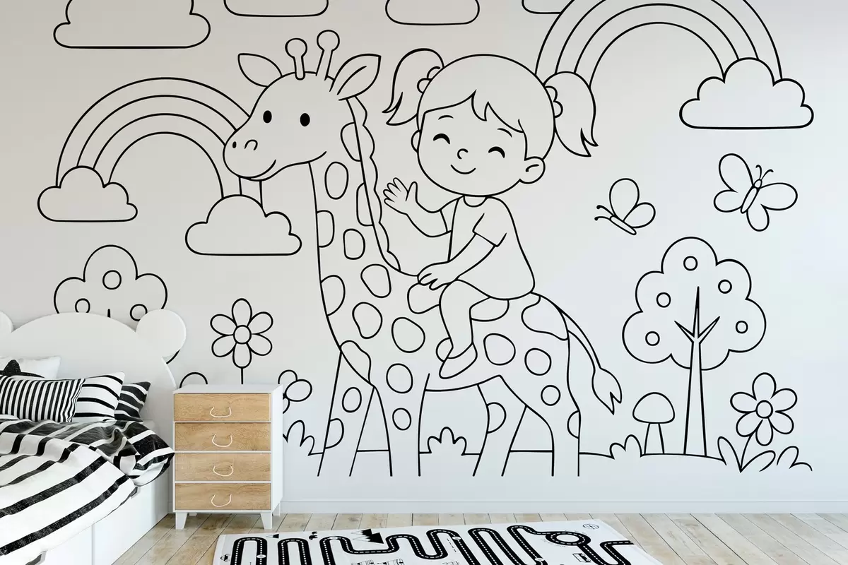 Fotomurales dibujo en blanco y negro de una niña sobre una jirafa al estilo de un libro para colorear infantil Nr. w04753