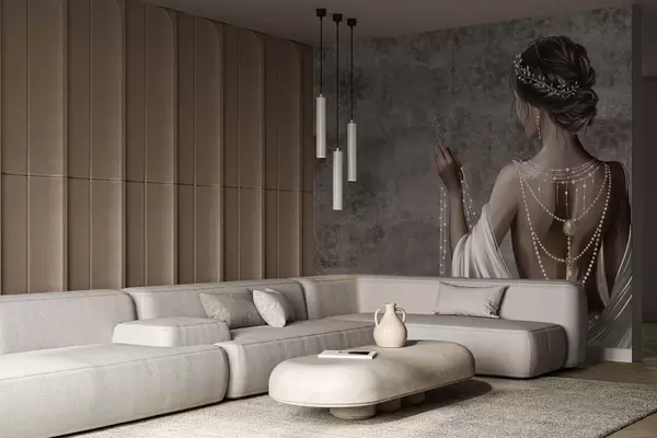 Fotomurales Mujer vista desde atrás con perlas, fondo con patrón de piedras grises Nr. w04854