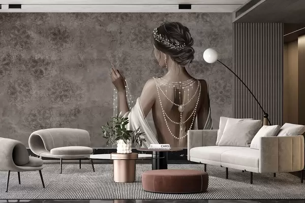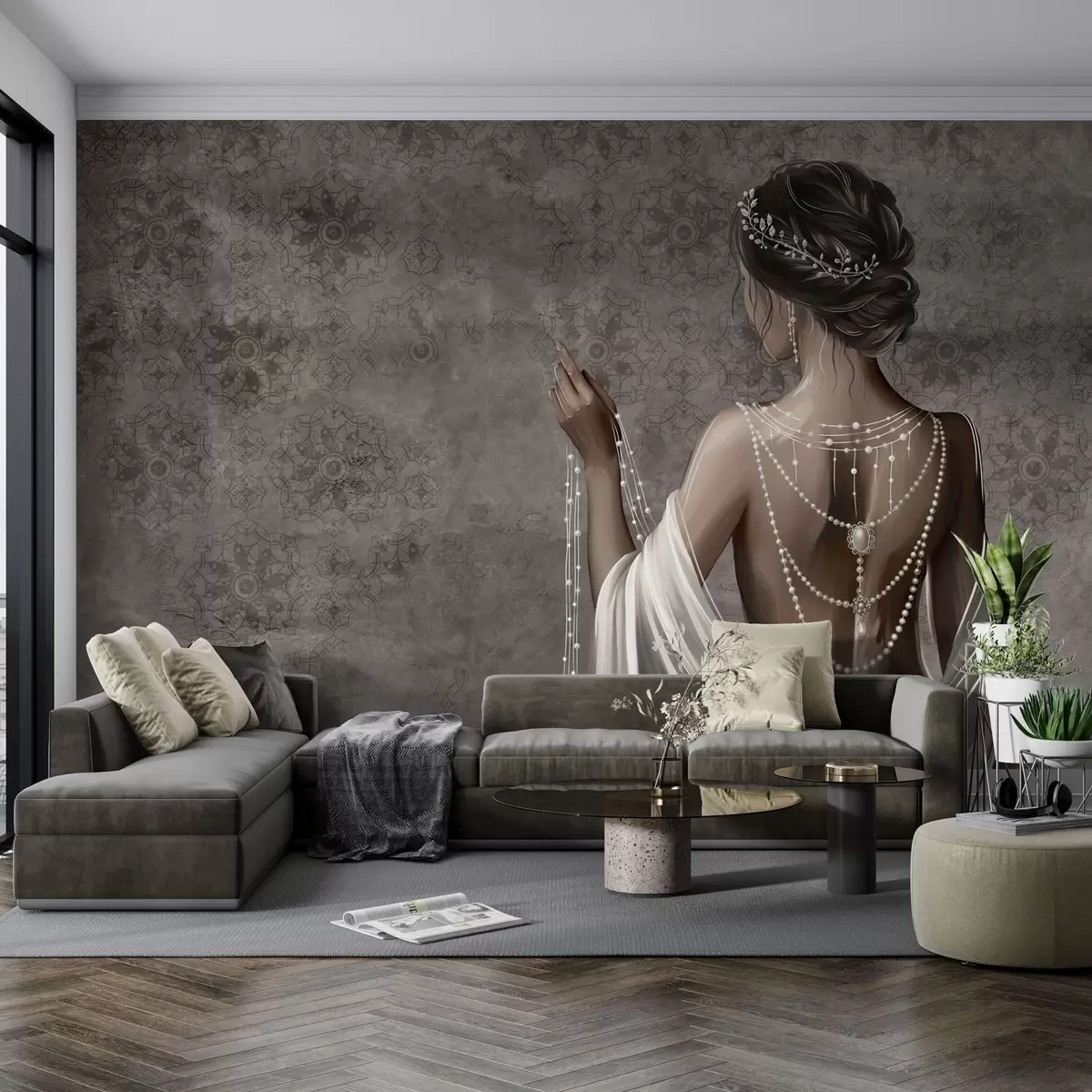 Fotomurales Mujer vista desde atrás con perlas, fondo con patrón de piedras grises Nr. w04854