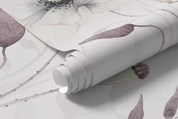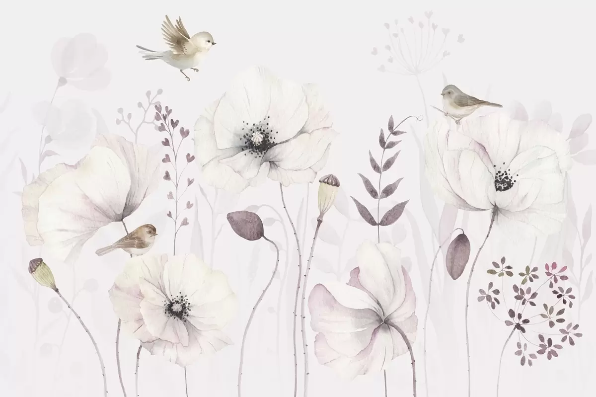Fotomurales Amapolas acuareladas con pequeños pájaros en suave color malva Nr. w04861