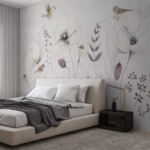 Fotomurales Amapolas acuareladas con pequeños pájaros en suave color malva Nr. w04861
