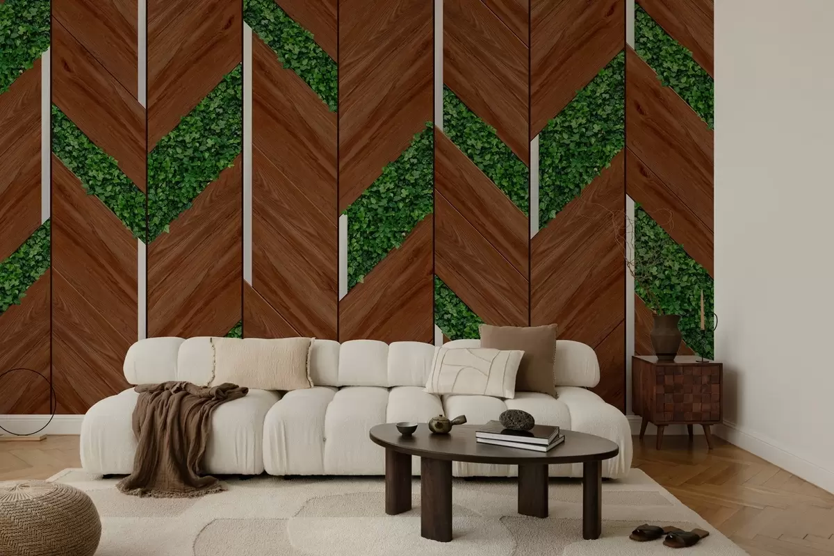 Fotomurales imitación de paneles de madera oscura con inserciones vegetales Nr. w04875v1