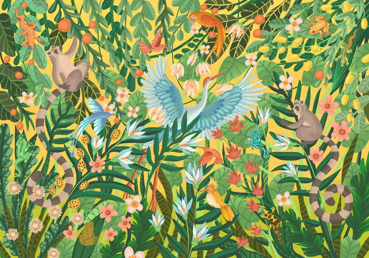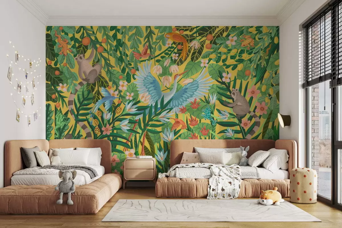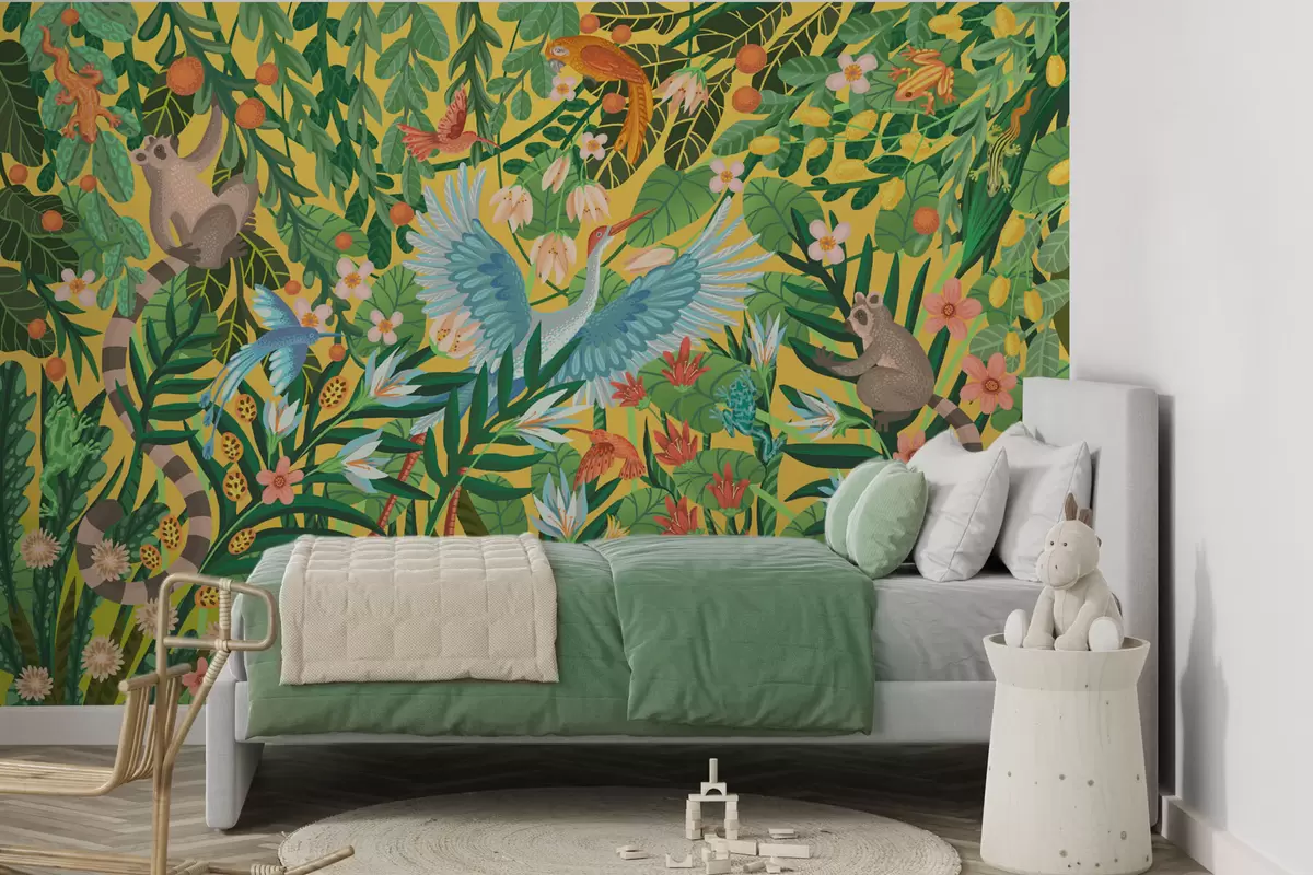 Fotomurales Escena luminosa con pájaros y animales en una densa vegetación. Nr. w05024v1