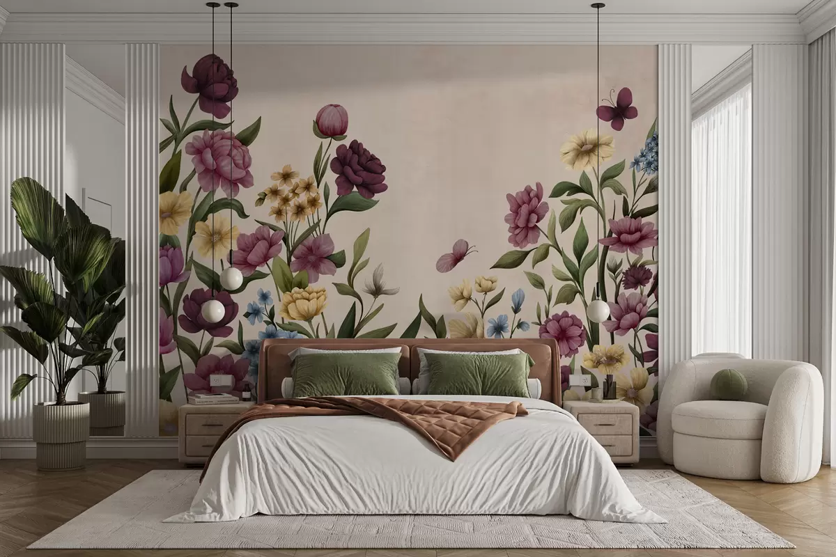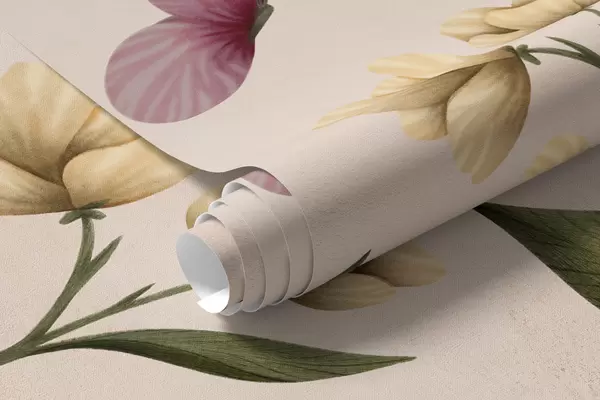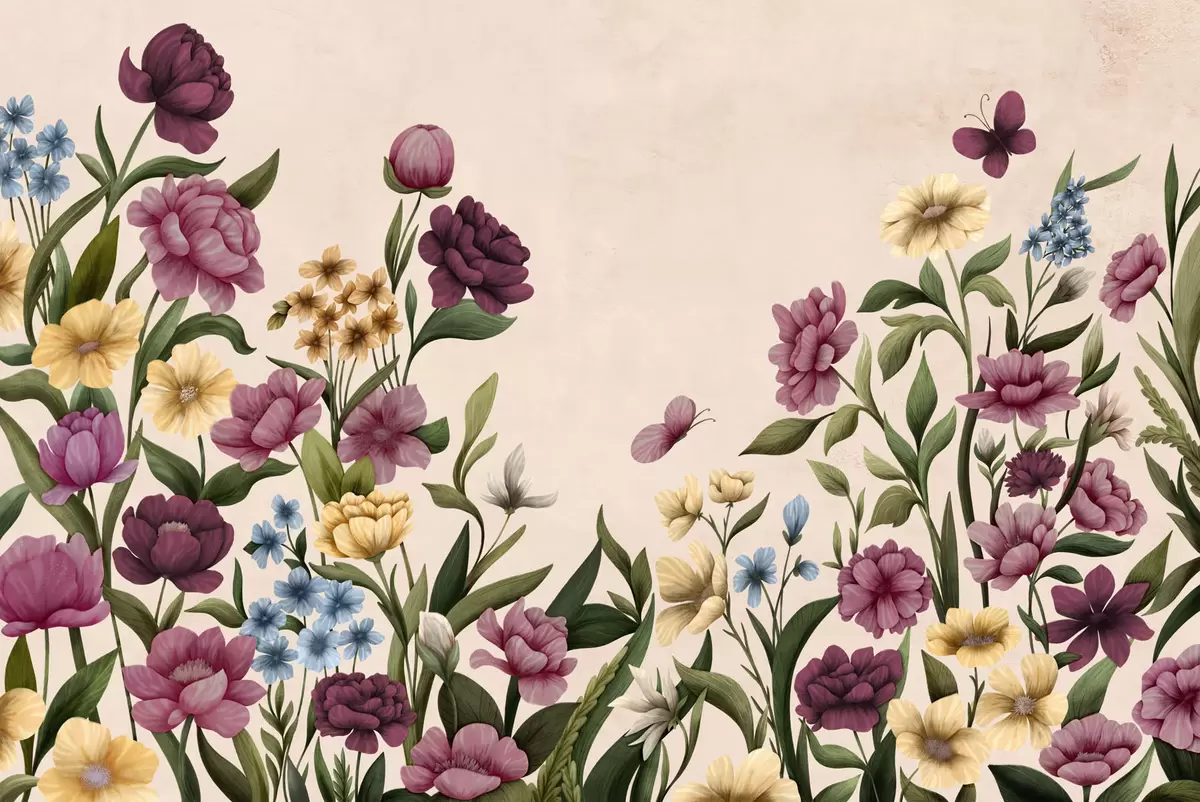 Fotomurales Composición floral con plantas y mariposas sobre fondo claro. Nr. w05072