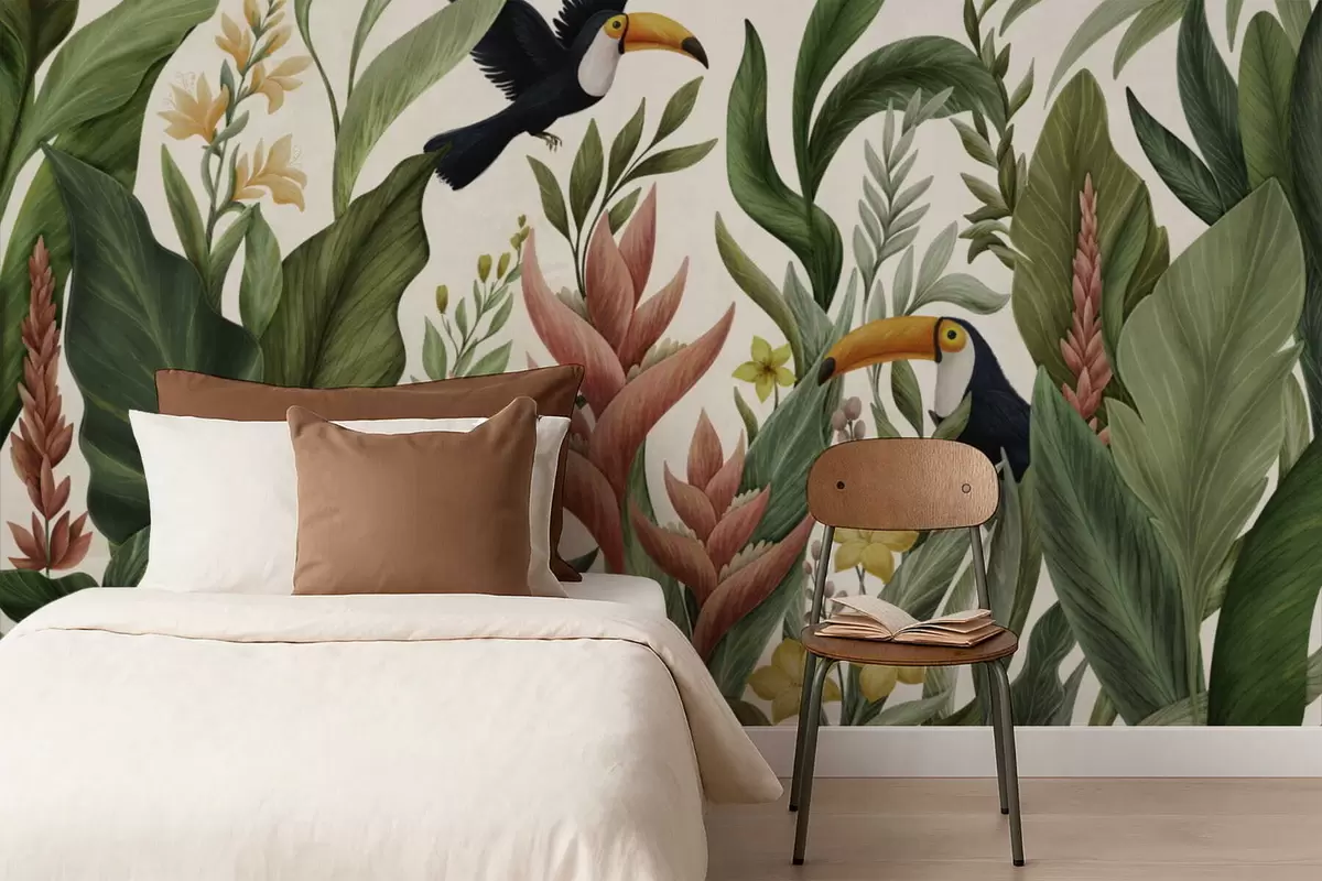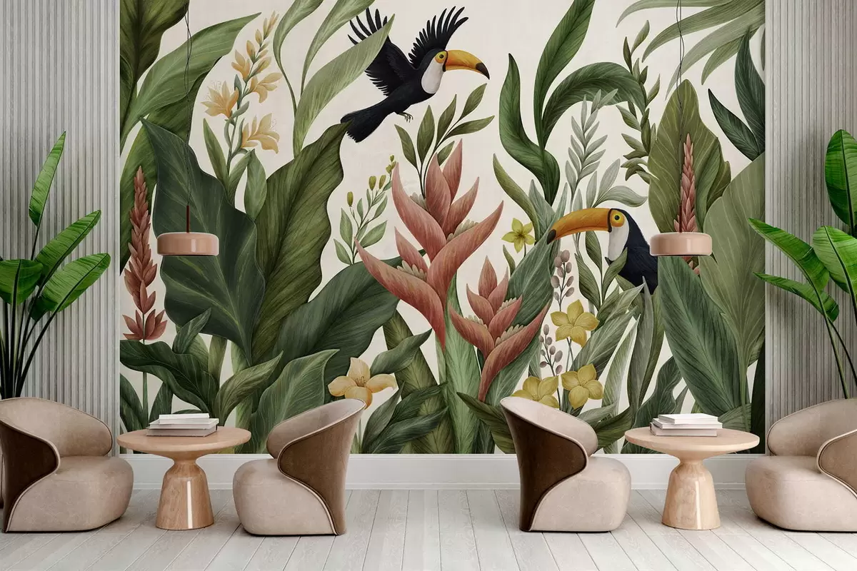 Fotomurales Plantas tropicales y aves de pico grande sobre fondo claro Nr. w05088v1