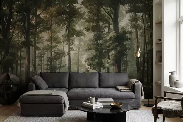 Fotomurales Ilustración de un bosque con niebla, árboles altos y un sendero. Nr. w05089