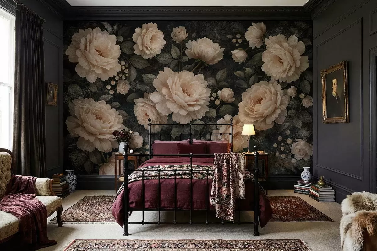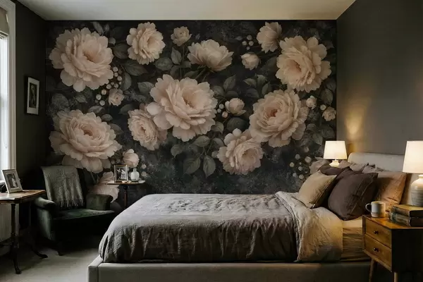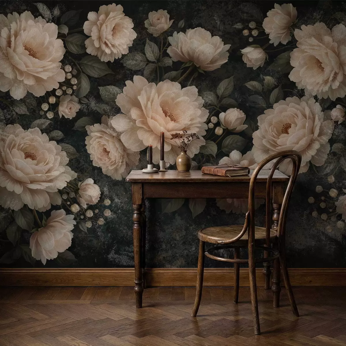 Fotomurales Flores voluminosas en tonos beige sobre fondo oscuro. Nr. w05114