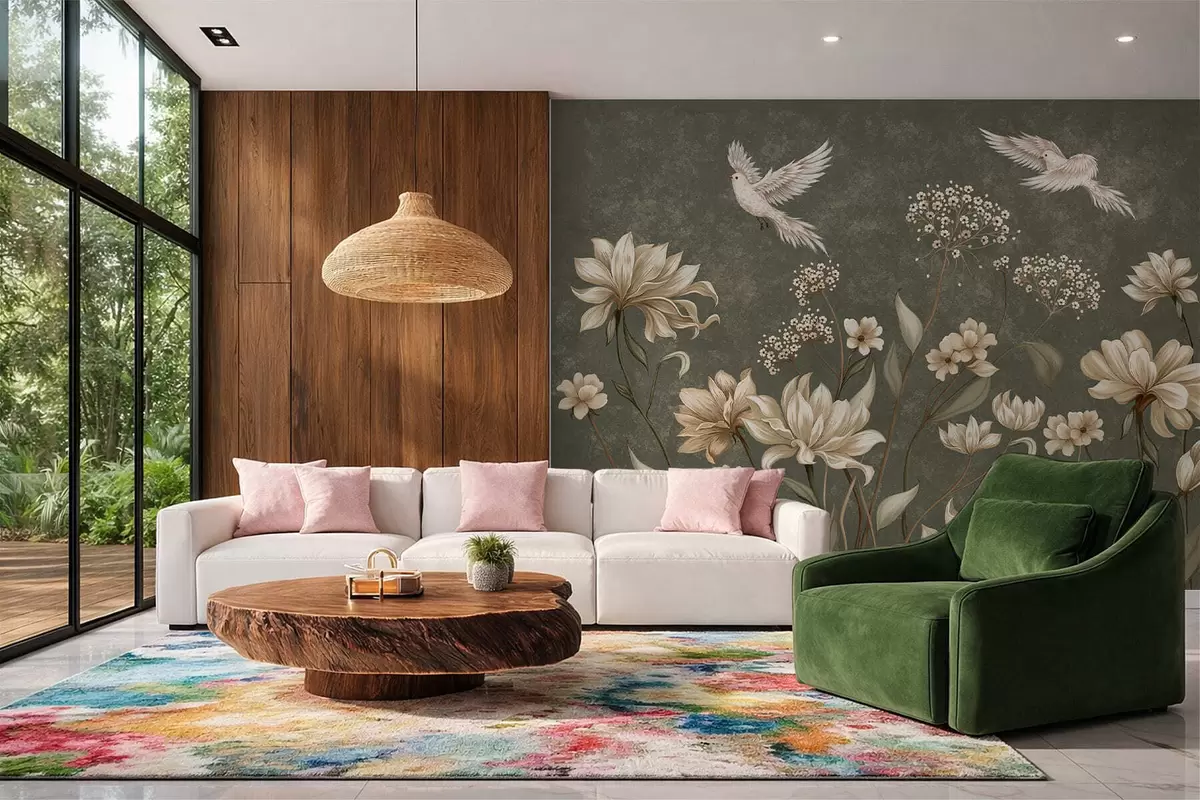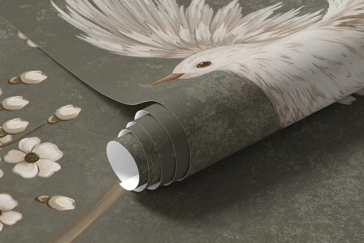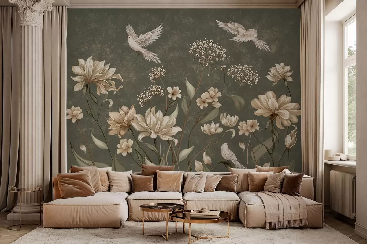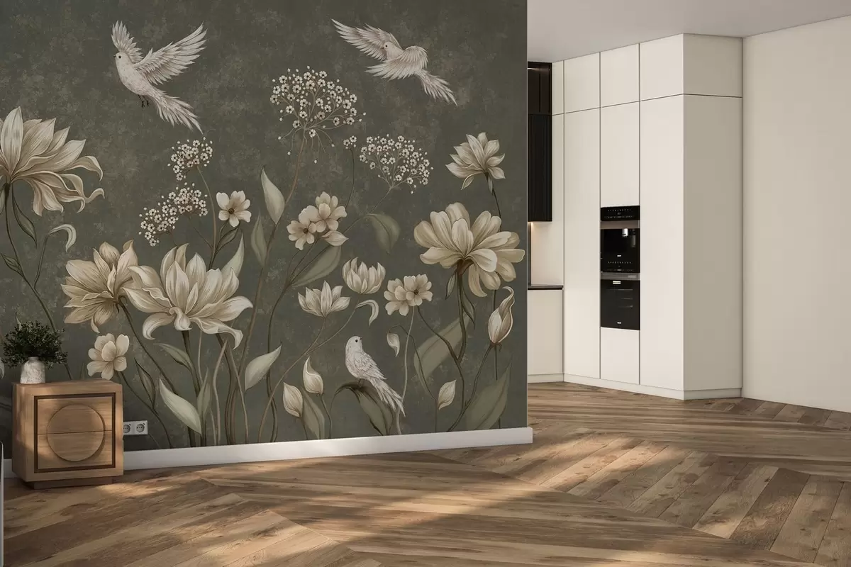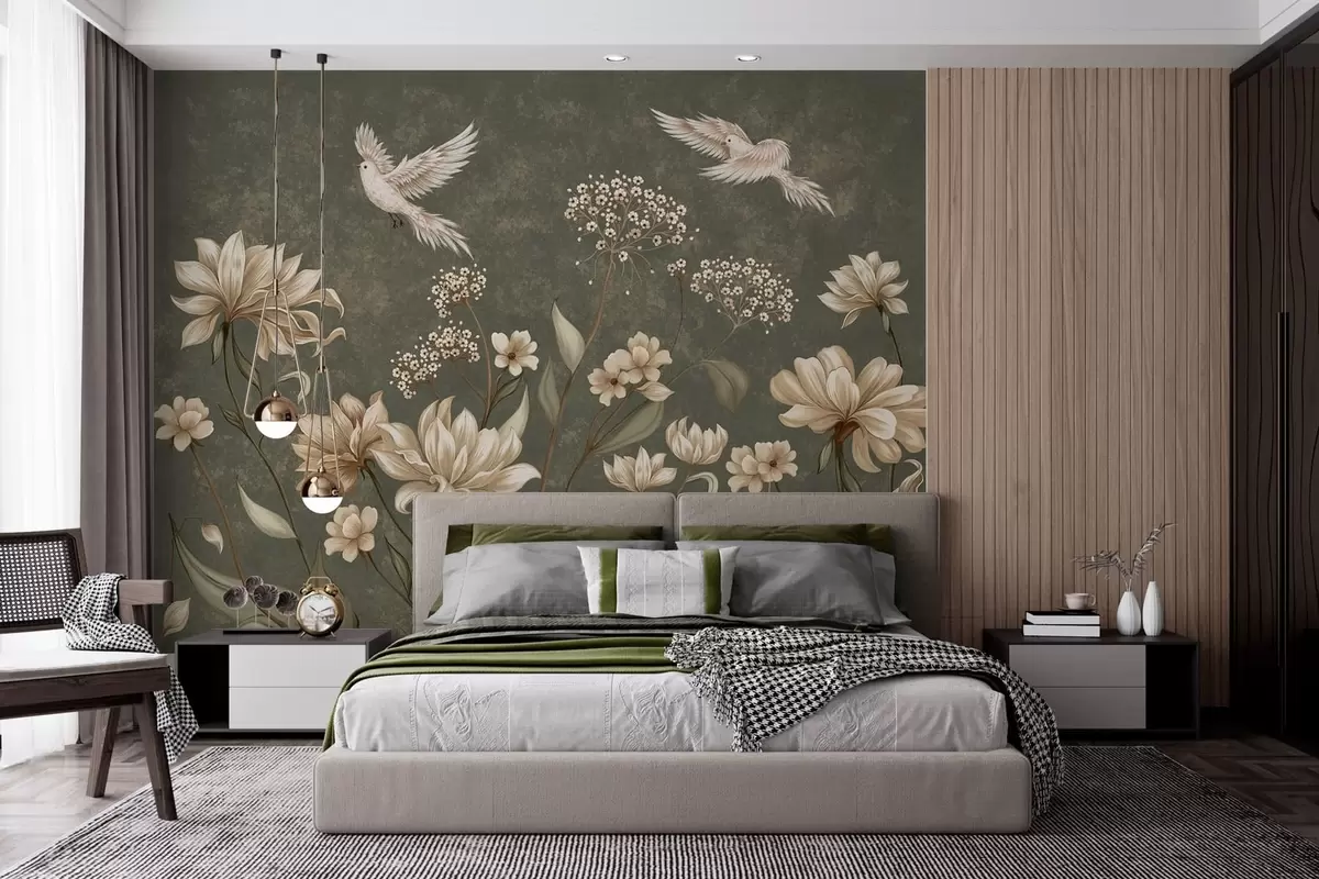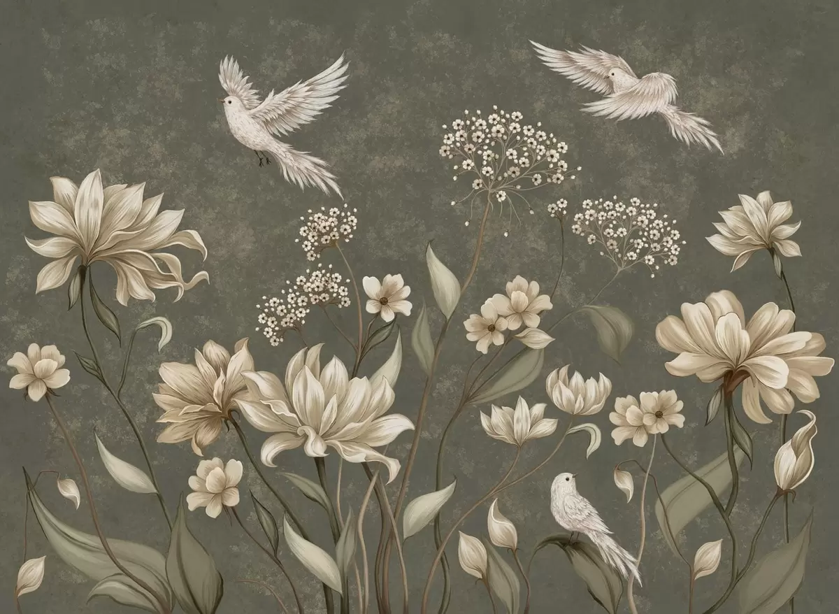 Fotomurales Flores y pájaros sobre un fondo verde oscuro Nr. w05118v3