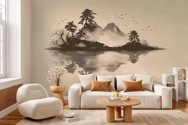 Fotomurales Paisaje montañoso en estilo sumi-e con pinos y reflejos Nr. w05124