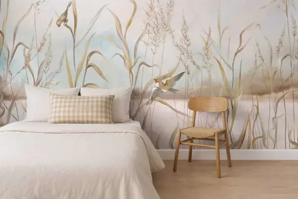 Fotomurales Ilustración de juncos y pájaros junto al agua en tonos suaves. Nr. w05125