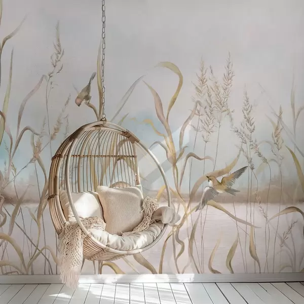 Fotomurales Ilustración de juncos y pájaros junto al agua en tonos suaves. Nr. w05125