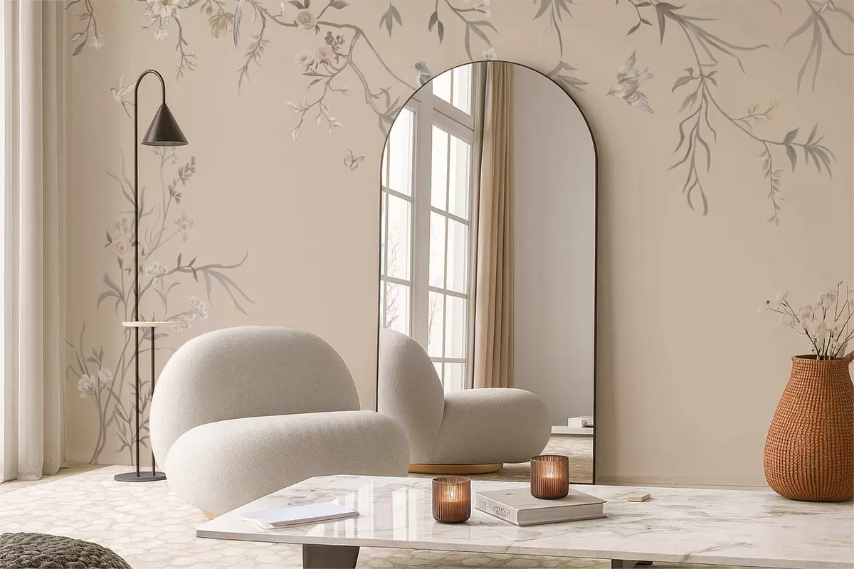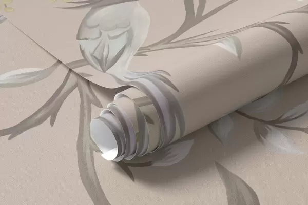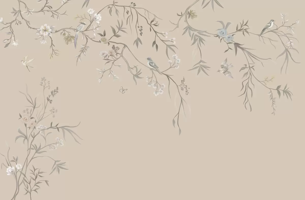 Fotomurales Ramas florales con pájaros sobre un fondo beige cálido Nr. w05127v1