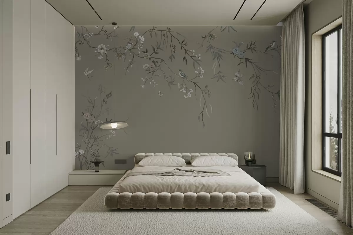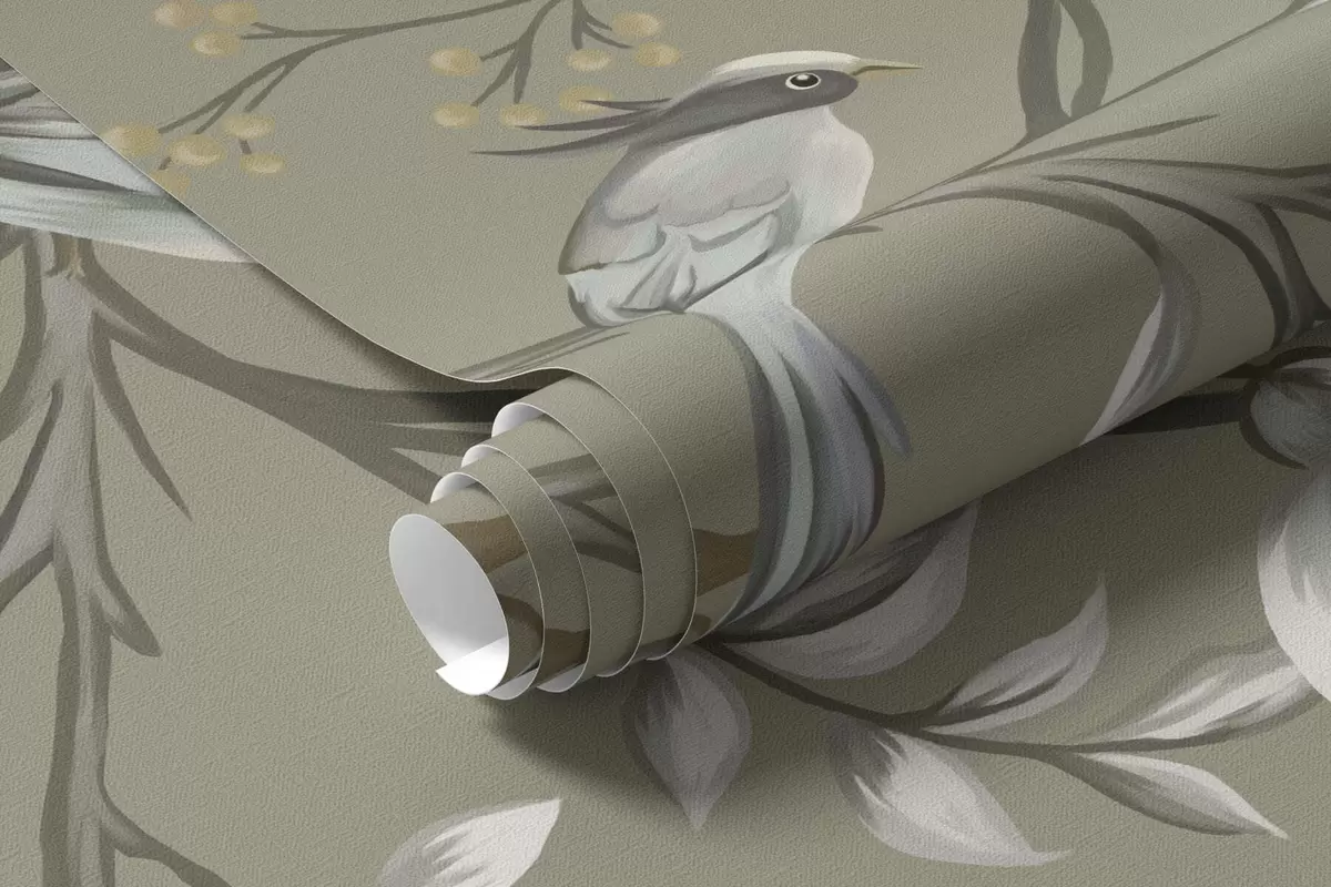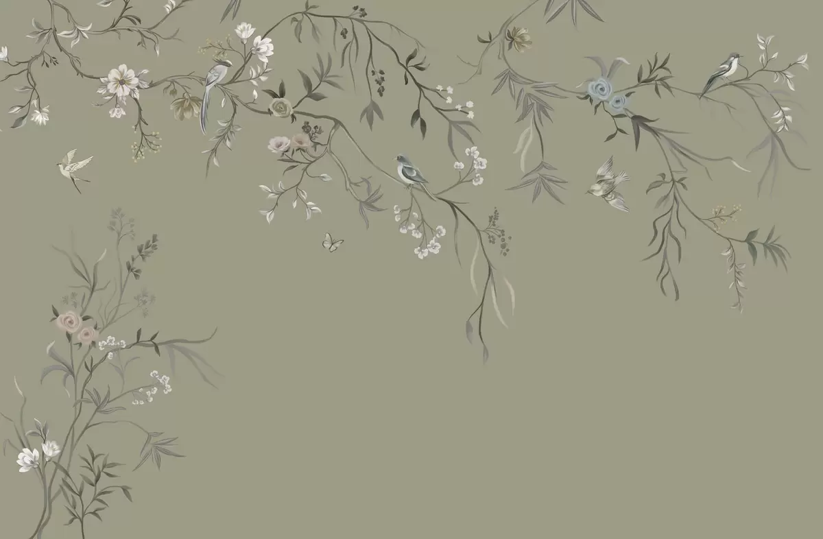 Fotomurales Motivo floral con pájaros sobre fondo gris Nr. w05127v4