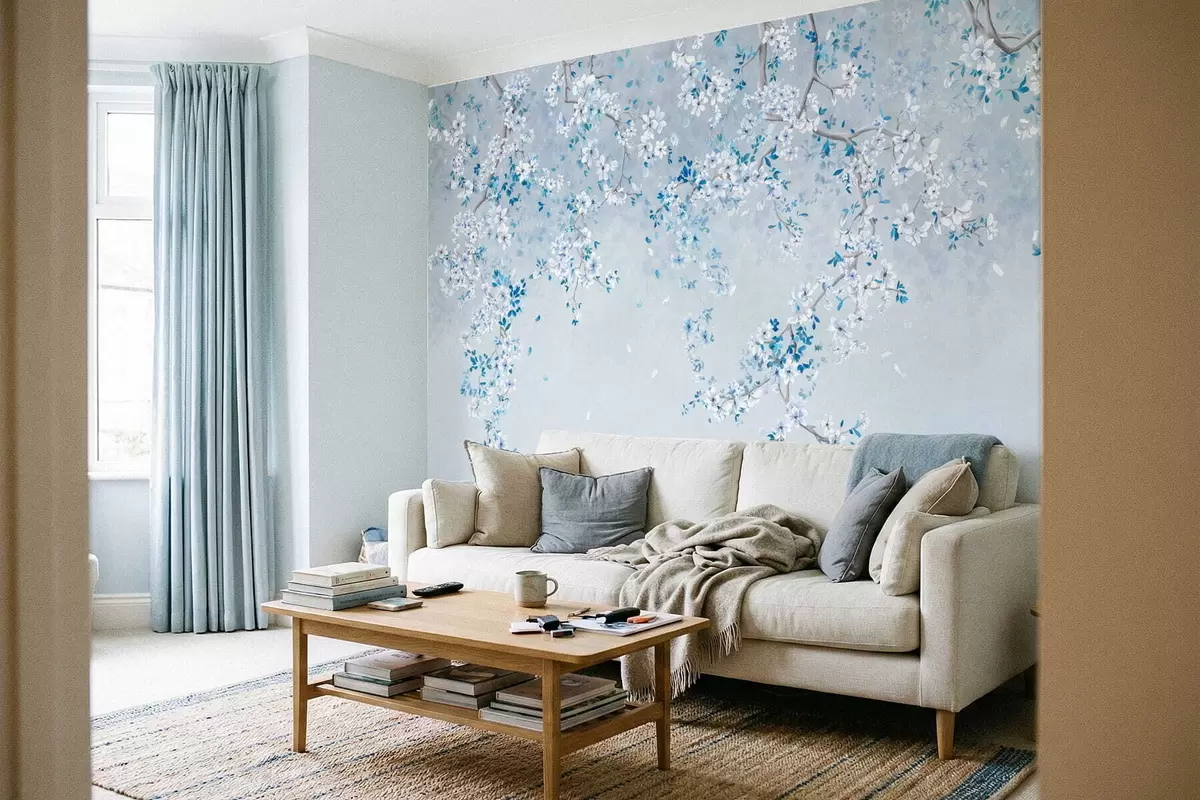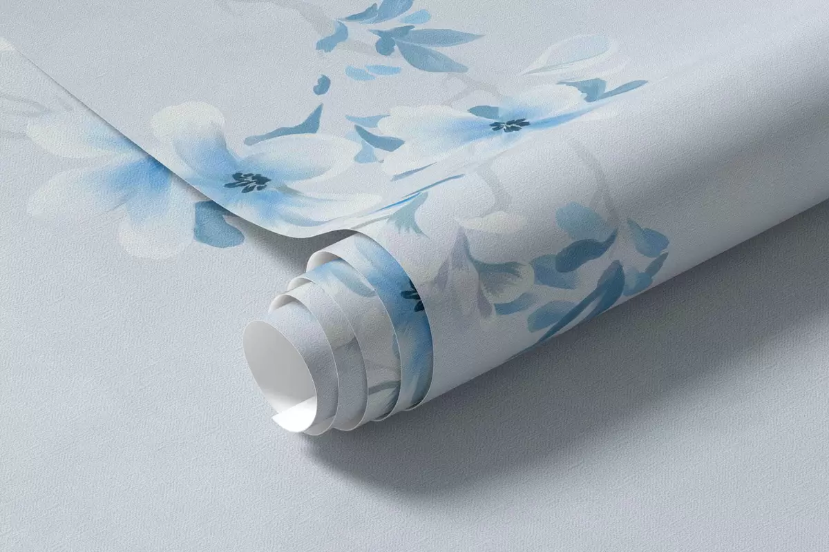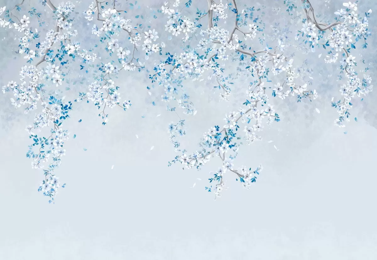 Fotomurales Ramas con flores blancas y azules sobre un fondo fresco. Nr. w05129v2