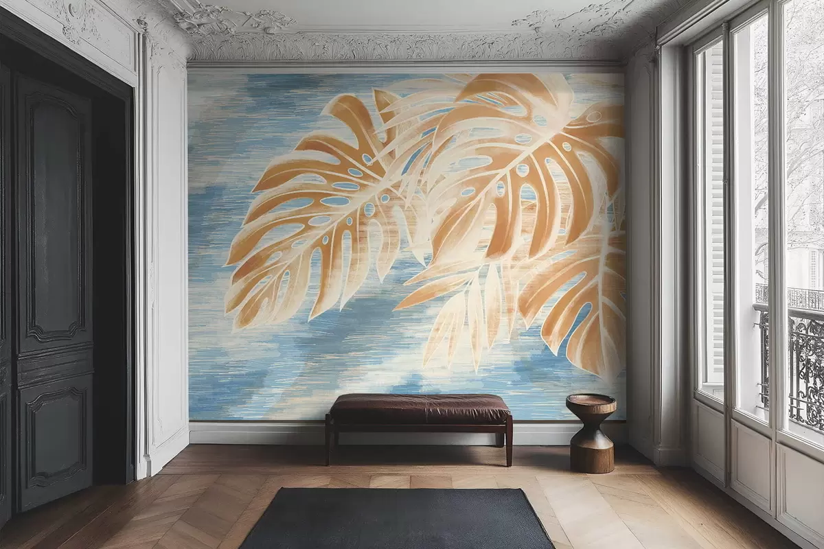 Fotomurales Hojas en tonos arena claros sobre fondo azul. Nr. w05130v1
