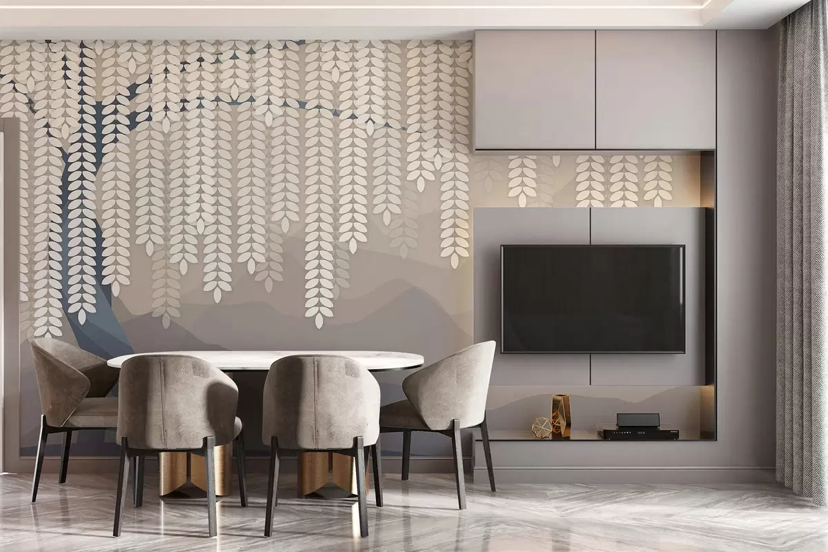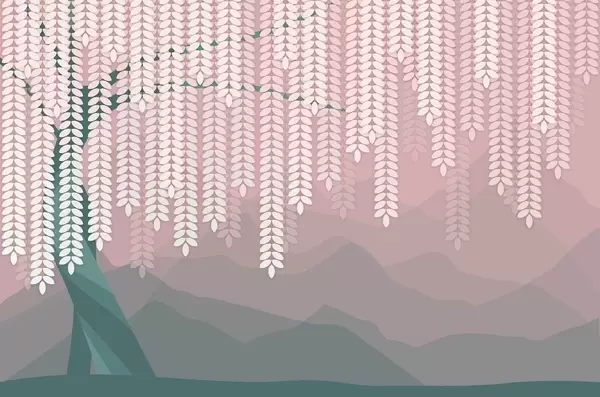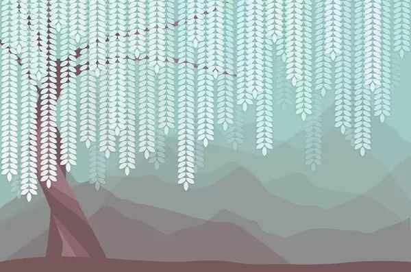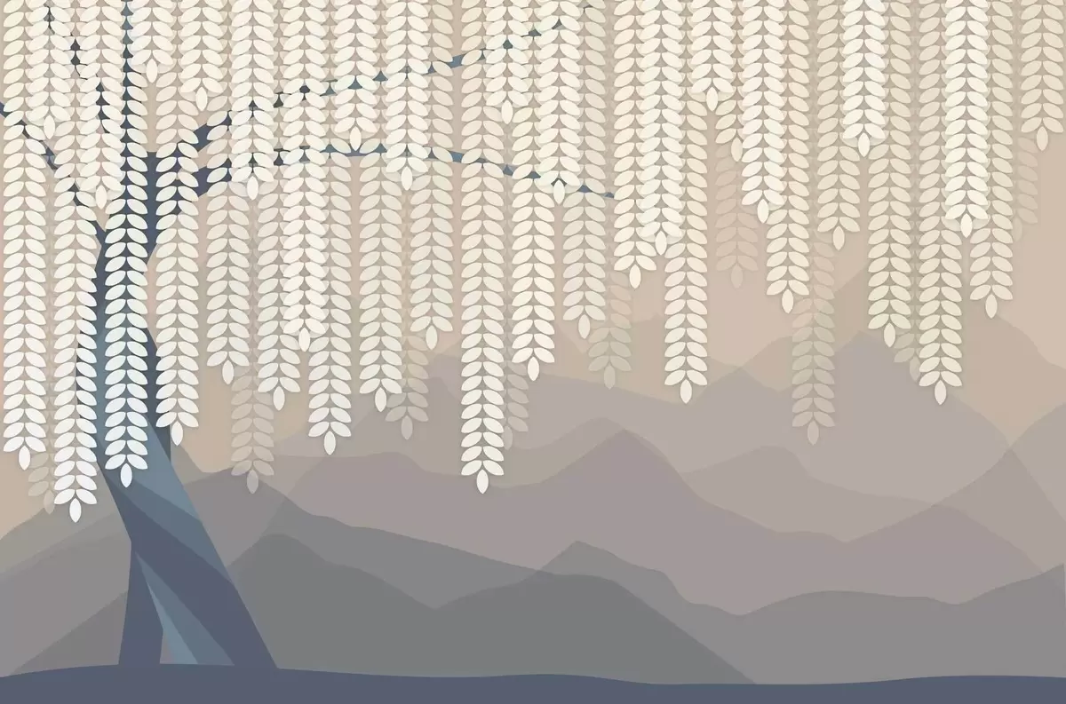 Fotomurales Sauce estilizado con hojas colgantes sobre un fondo de montañas minimalistas en tonos beige y azul verdoso. Nr. w05232