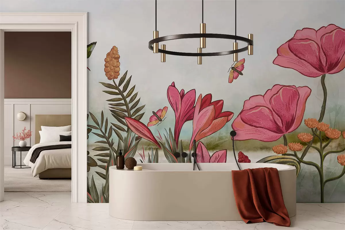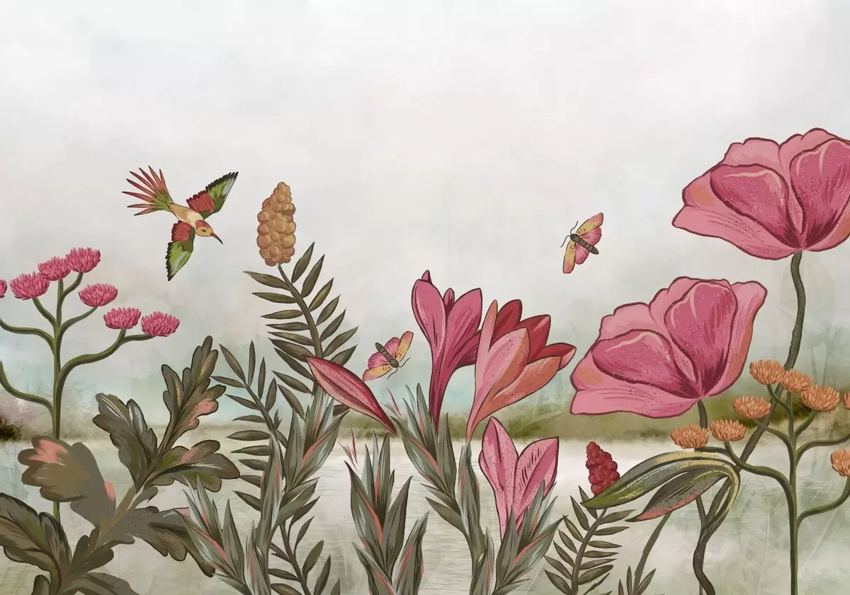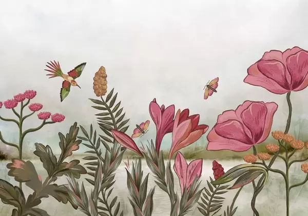 Fotomurales Flores brillantes con pájaros y mariposas Nr. w05321