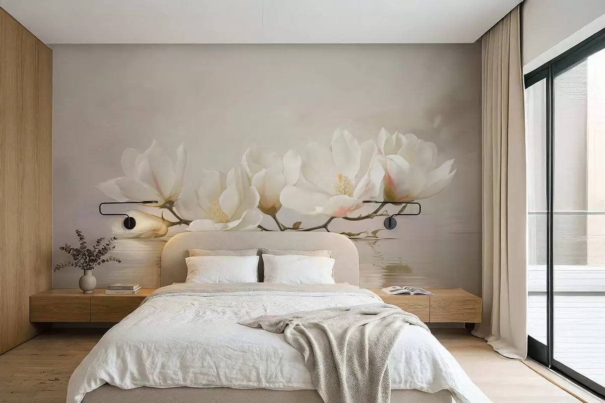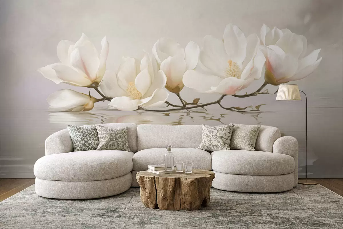 Fotomurales Ligeras flores de magnolia en una rama sobre el reflejo del agua. Nr. w05353