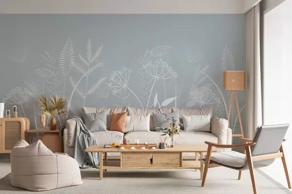 Fotomurales delicadas hierbas silvestres y flores pintadas a mano sobre un fondo gris azulado Nr. w05383