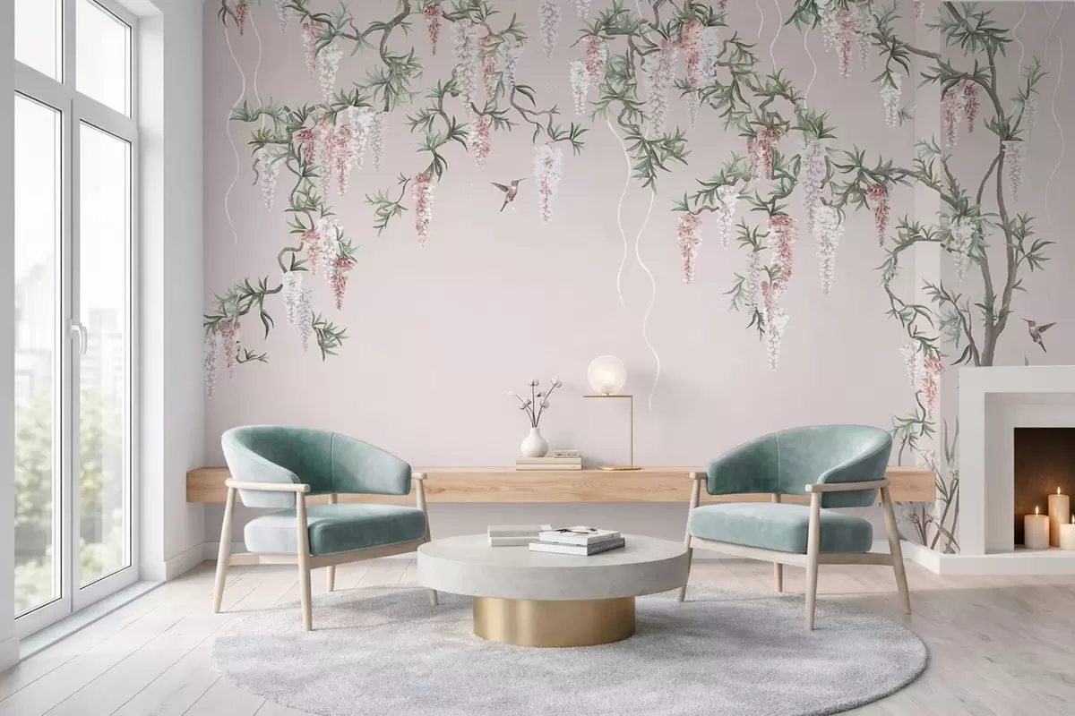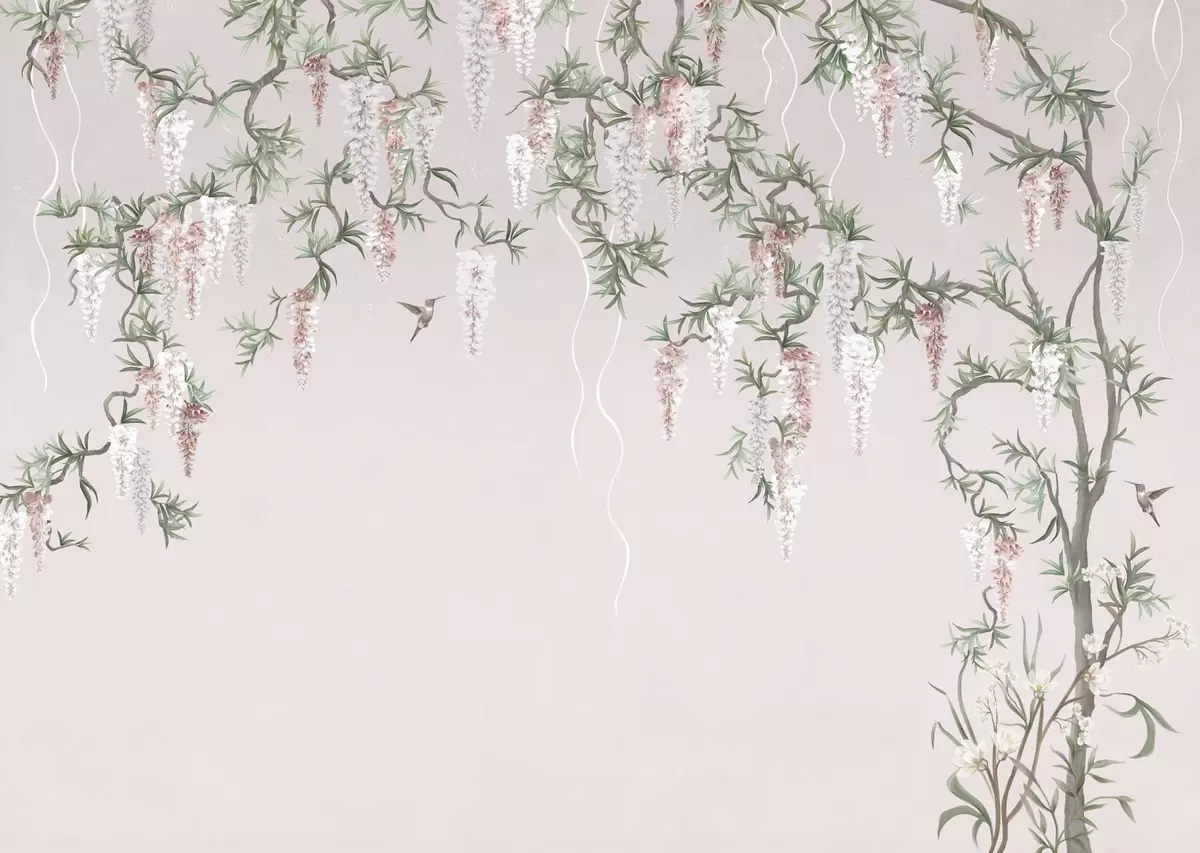 Fotomurales Ramas en flor con capullos rosas y pájaros Nr. w05394v1