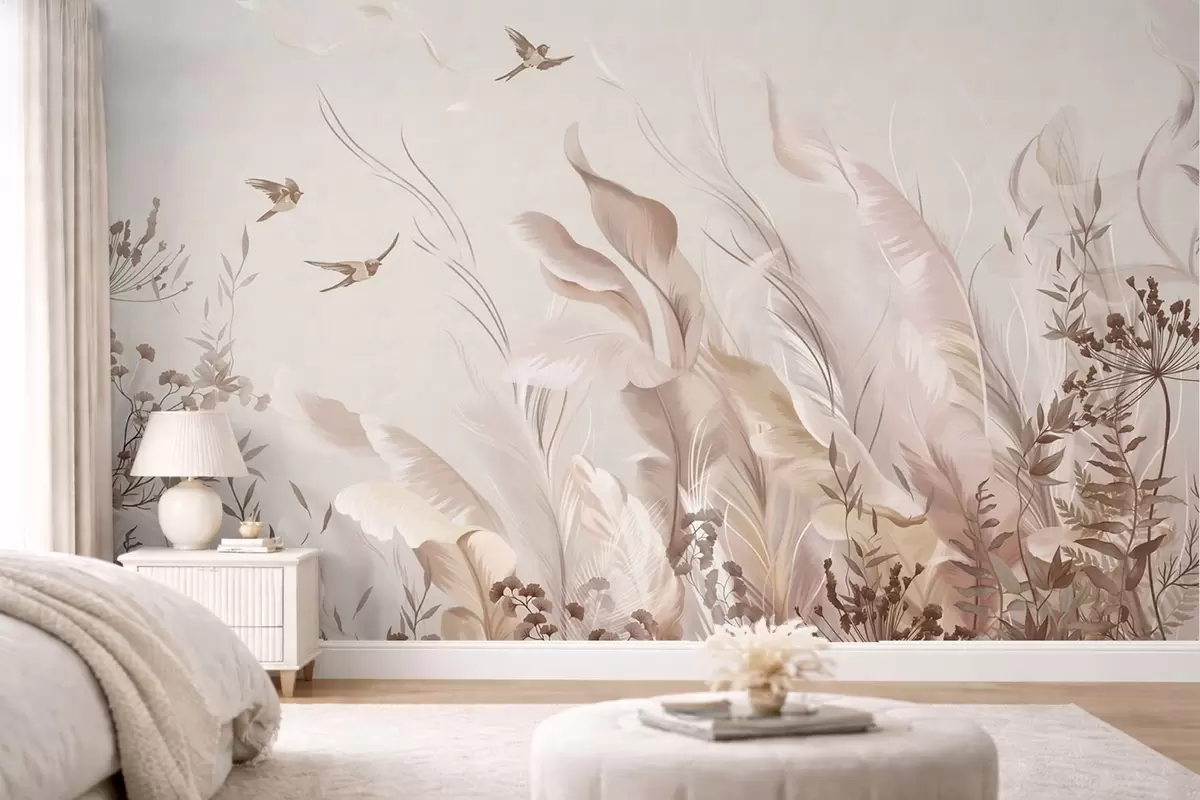 Fotomurales Plumas suaves, hierbas y pájaros en tonos claros Nr. w05395