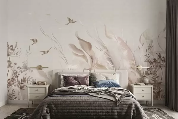 Fotomurales Plumas suaves, hierbas y pájaros en tonos claros Nr. w05395