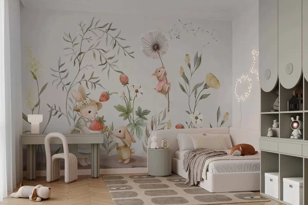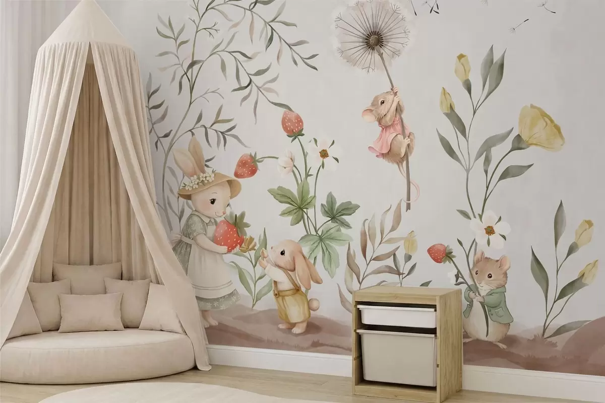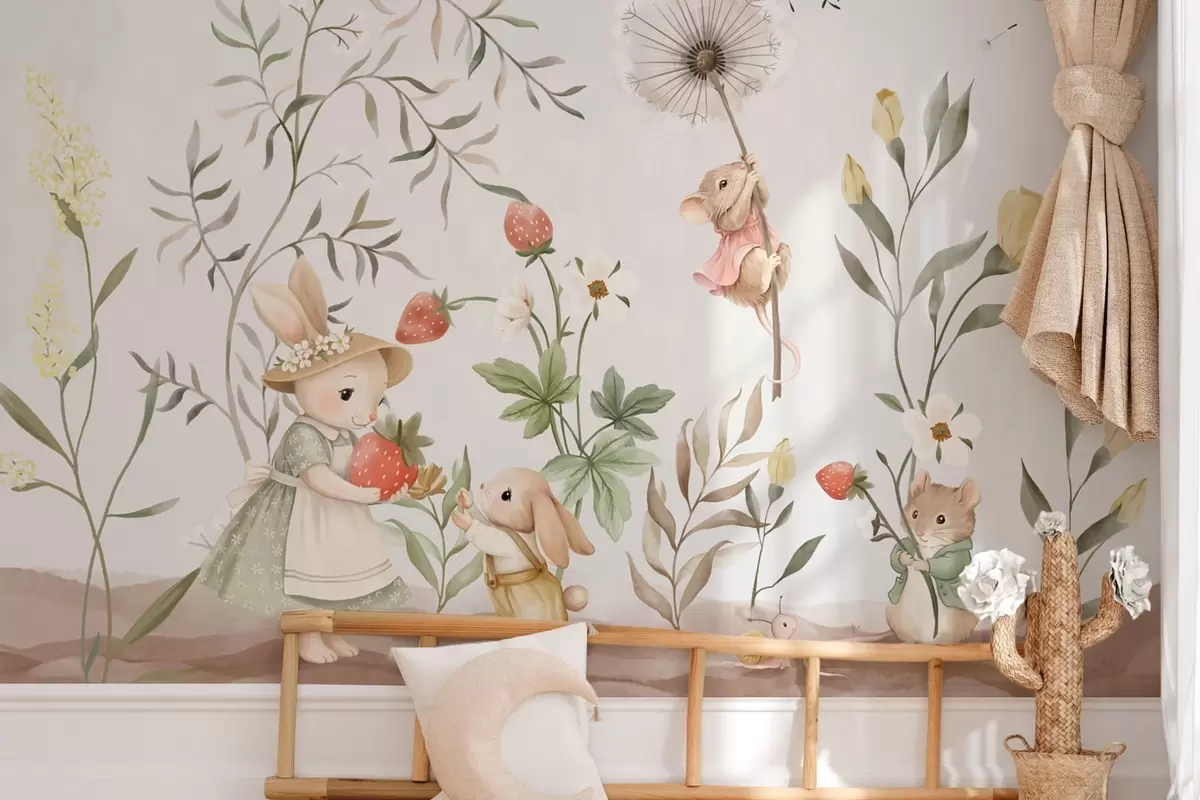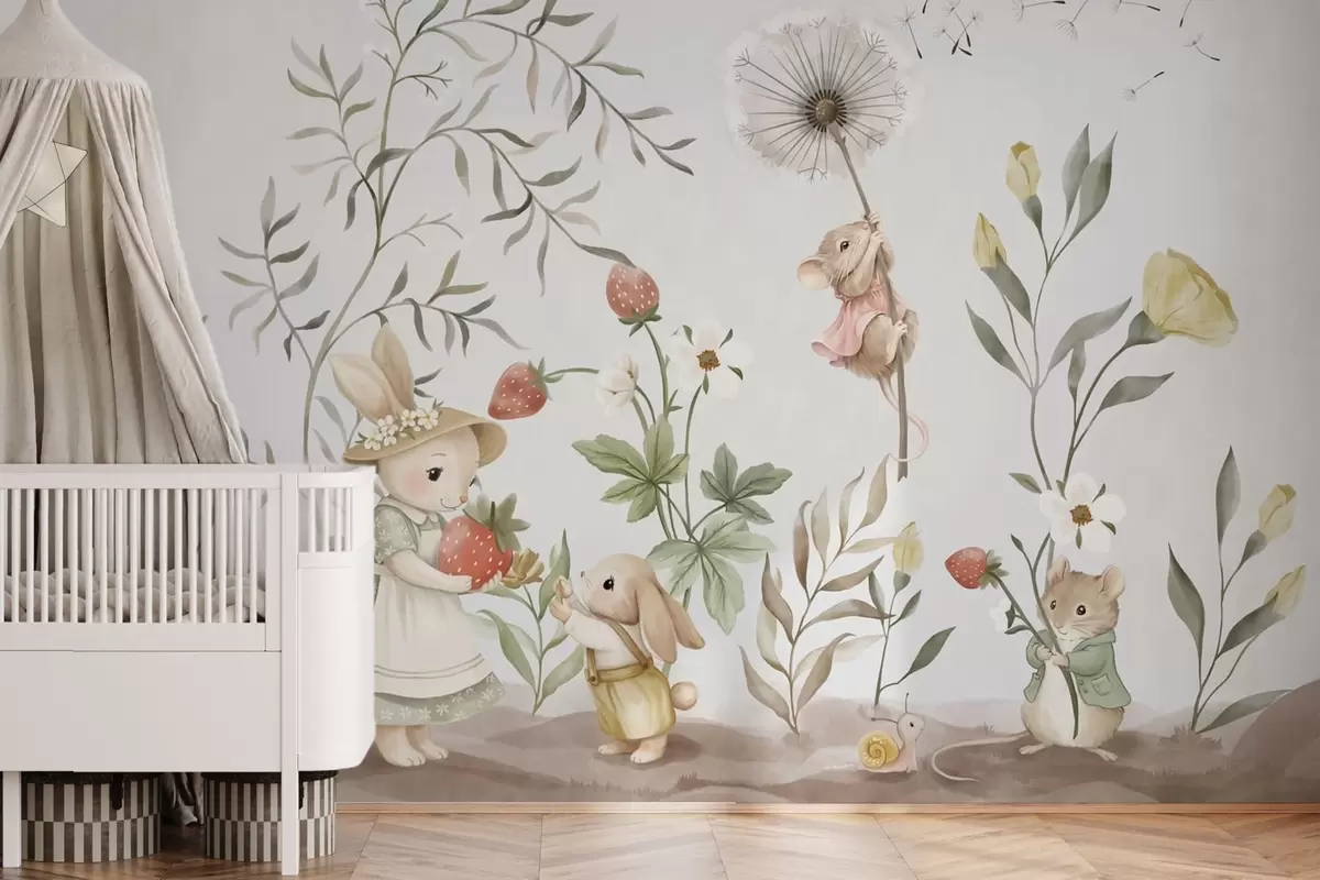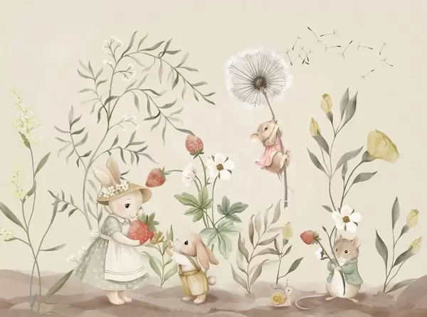 Fotomurales Ilustración infantil de un conejito y un ratoncito entre plantas y flores Nr. w05422