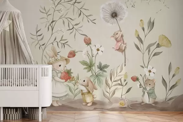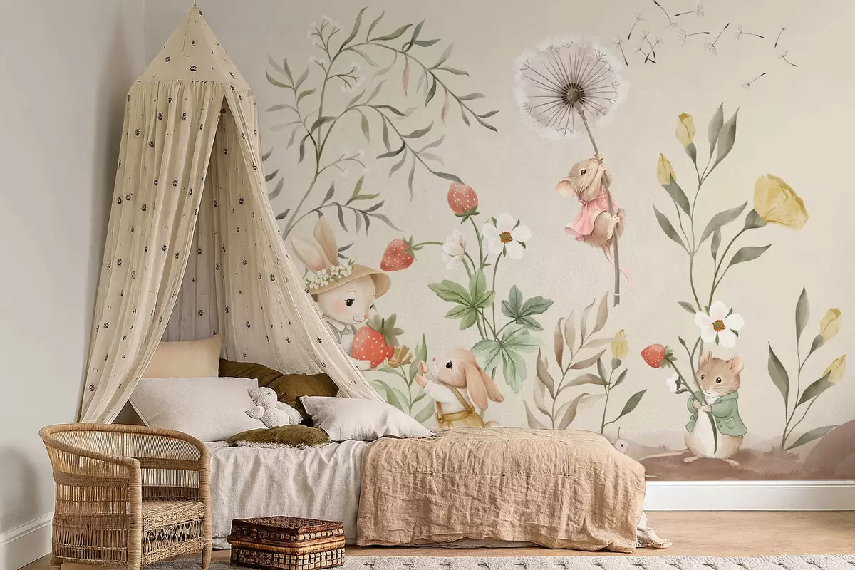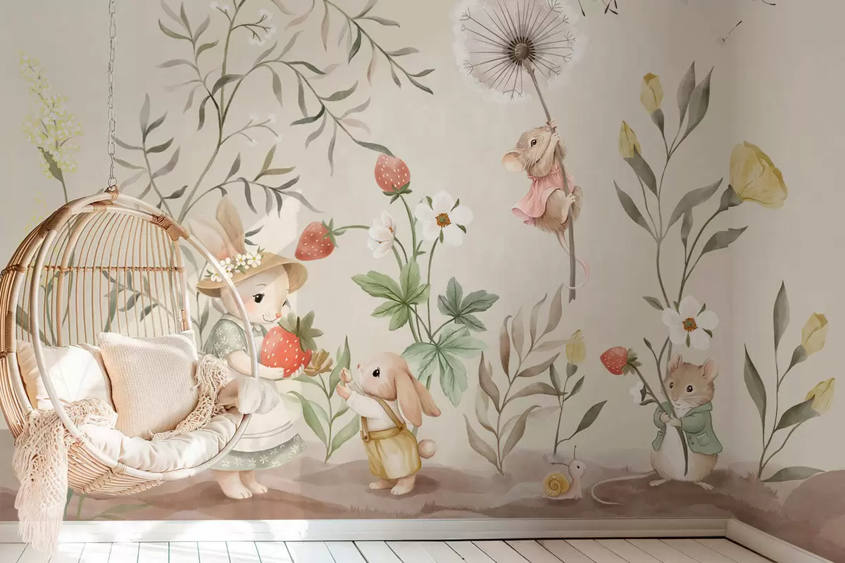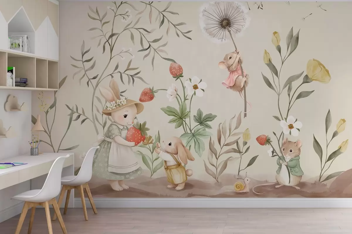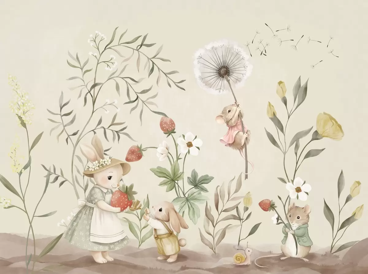 Fotomurales Ilustración de un conejito, un ratón y unas plantas con fresas Nr. w05422v2