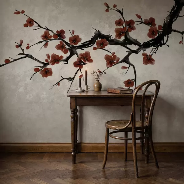 Fotomurales Rama con flores de color rojo oscuro sobre un fondo neutro Nr. w05425v1