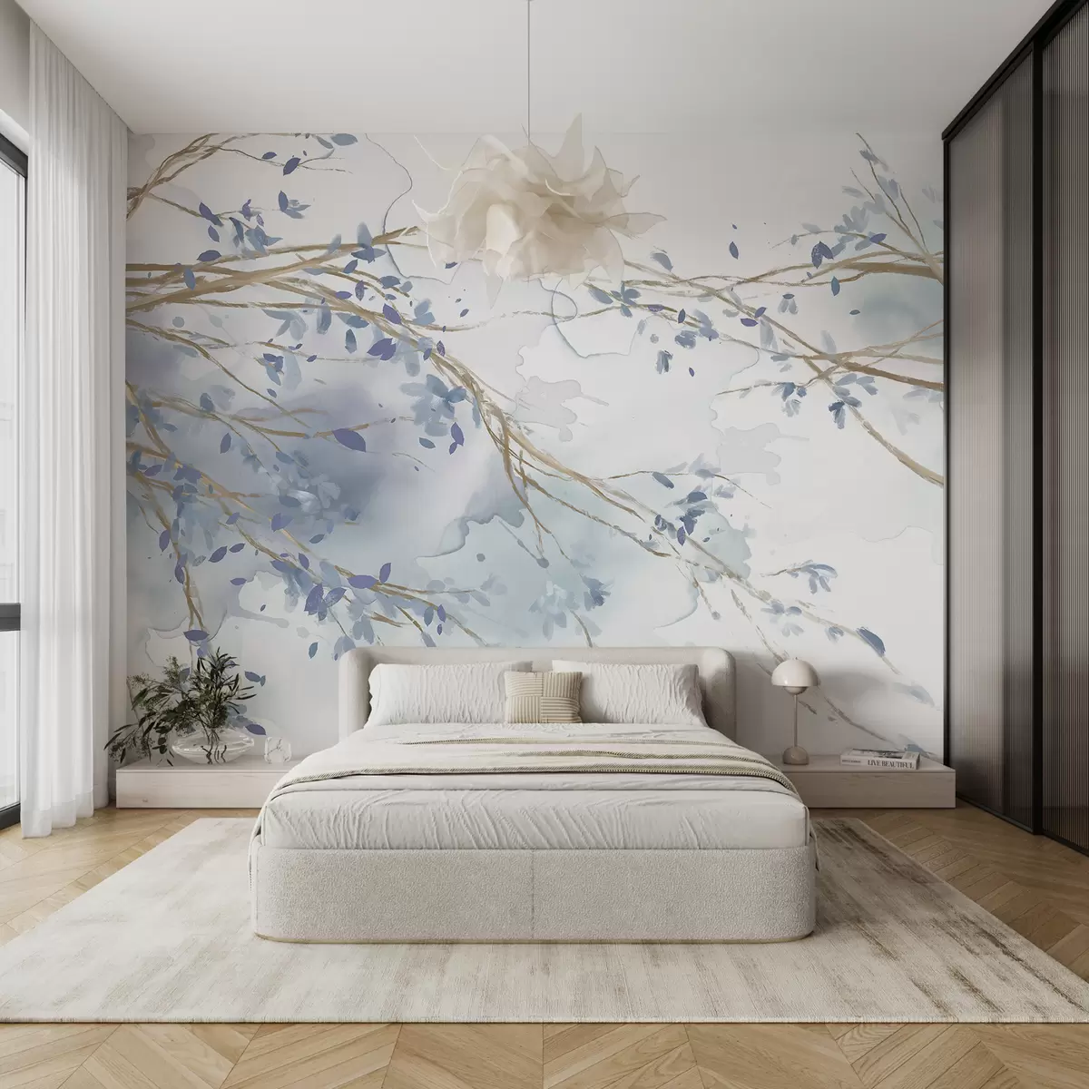 Fotomurales Delicadas ramas florales azules y blancas con fondo de acuarela suave y borroso Nr. w07919