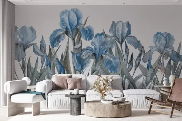 Fotomurales Grandes lirios azules pintados sobre un muro de hormigón blanco Nr. w07949v4