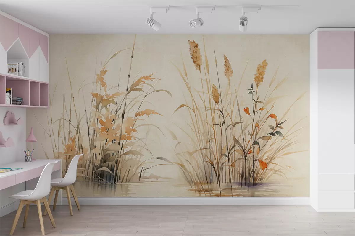 Fotomurales Arbustos de caña en una textura de estanque, acuarela, color beige, naranja Nr. w07964