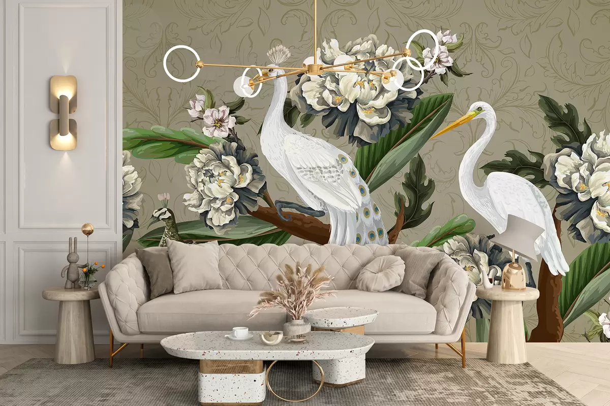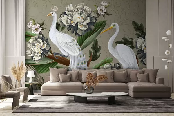 Fotomurales Un par de pavos reales blancos con colas largas rodeados de grandes flores de peonía blanca y exuberante follaje verde. Nr. w07975